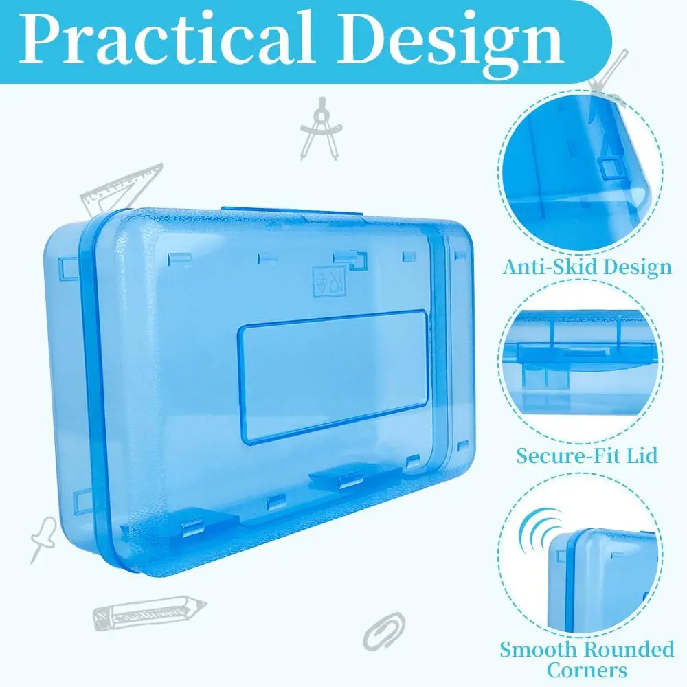 Interlocking concave-convex slots enable stable stacking. Frosted non-slip edges ensure a secure grip. Dual-button reinforced hinges provide smooth opening/closing. Ideal for desks, classrooms, or travel.