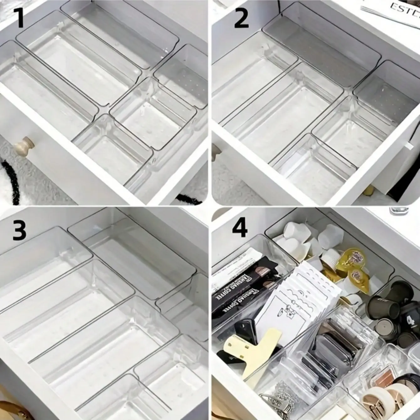 7pcs Clear Plastic Cosmetics Storage Box Set - Stackable Drawer Baffles Multi Grids Organizer for Cosmetics, Office Supplies and Desktop Storage, Easy Assembly, No Power Required, Cosmetics Organizer Storage