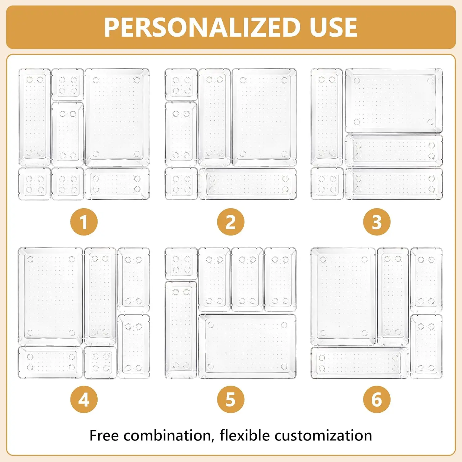 Includes 4 different sizes to create custom drawer layouts for any space. Easily arrange shelves, dressers, closets, and cabinets with a mix of large and small bins to fit your storage needs.