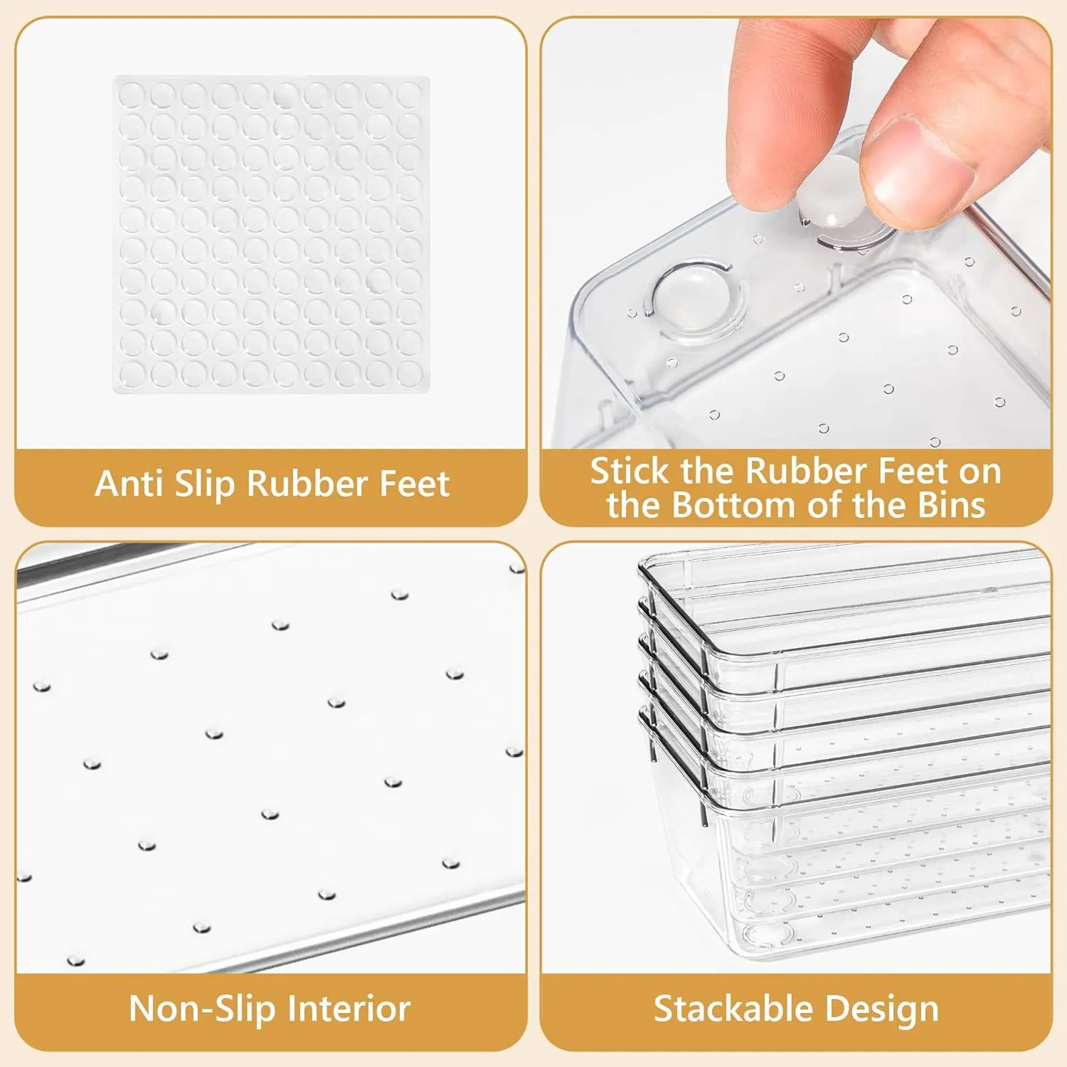 Includes 100+ silicone pads for a non-slip grip, preventing movement inside drawers. Bins can also be stacked to maximize space, keeping everything tidy and accessible.