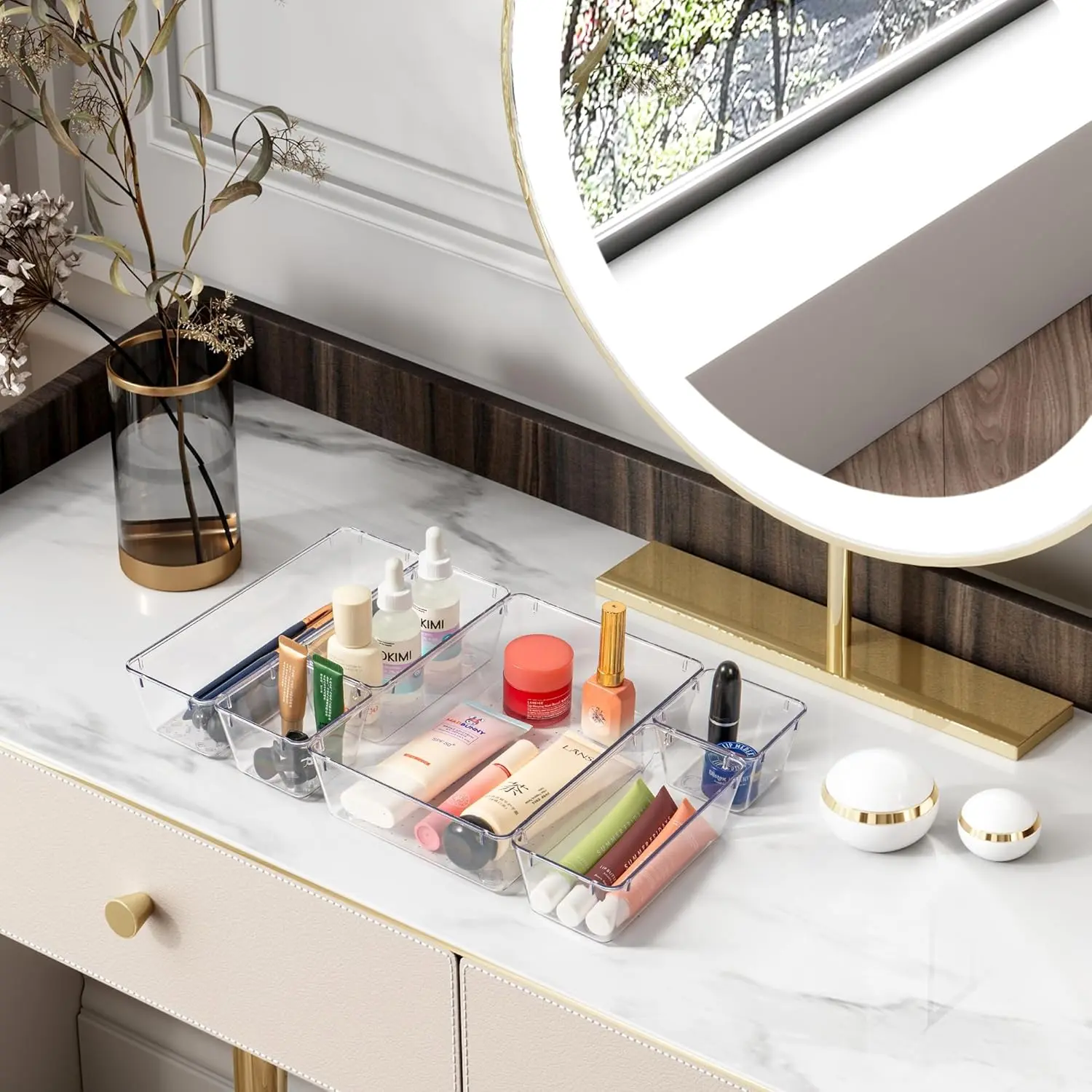 Keep your drawers neat with this 25-piece clear plastic drawer organizer set. Perfect for bathrooms, kitchens, offices, vanities, and bedrooms, these stackable storage bins help organize makeup, utensils, office supplies, and more with ease.