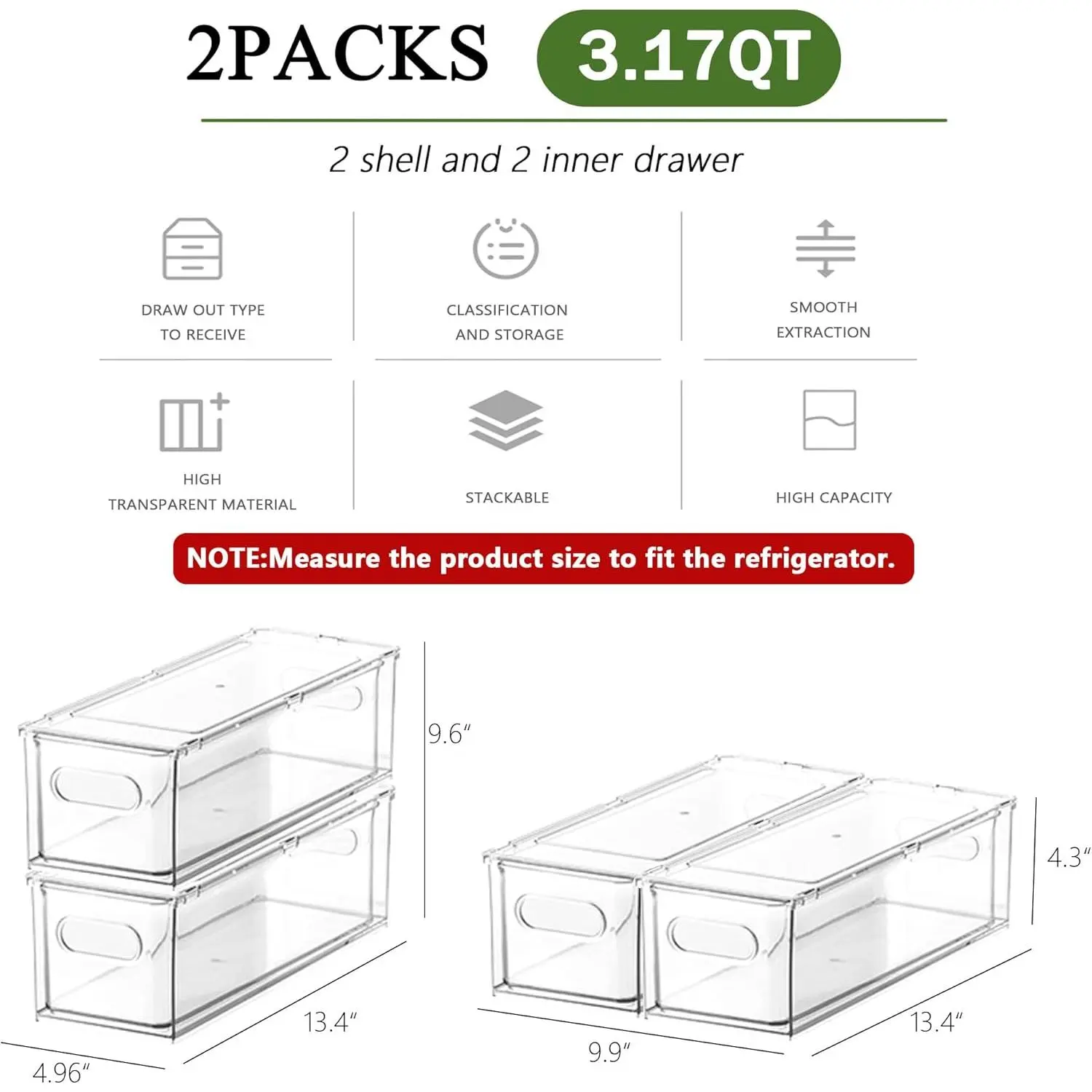 【𝐏𝐚𝐜𝐤𝐚𝐠𝐞 𝐢𝐧𝐜𝐥𝐮𝐝𝐞】 Measures 1 Package includes 2 shell and 2 inner drawer. Two identical 3.17-quart (13.4"L x 4.96"W x 4.3"H)drawer storage boxes can meet your needs.Do not place the plastic storage bins in dishwasher.(Please confirm the size is suitable for your fridge.)
