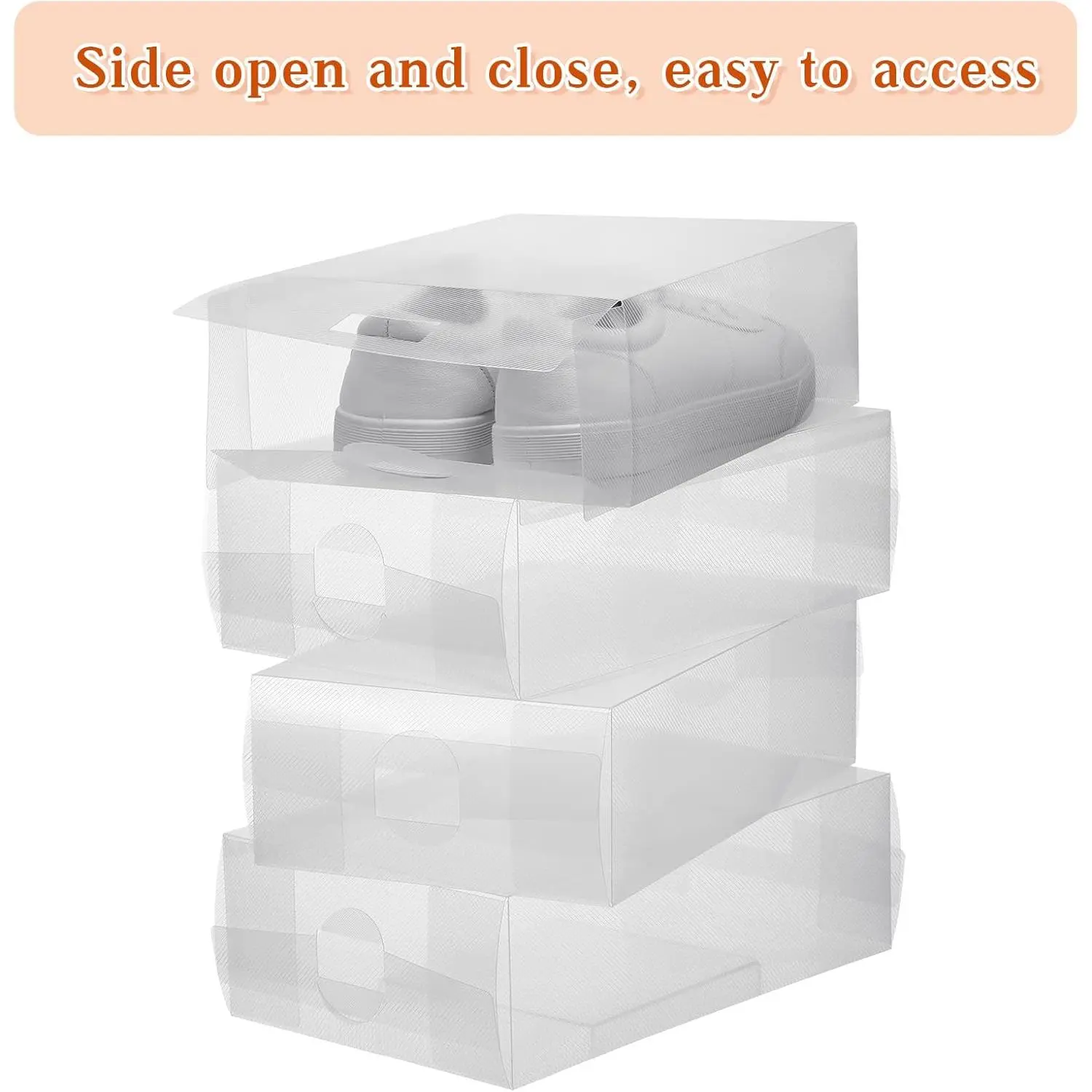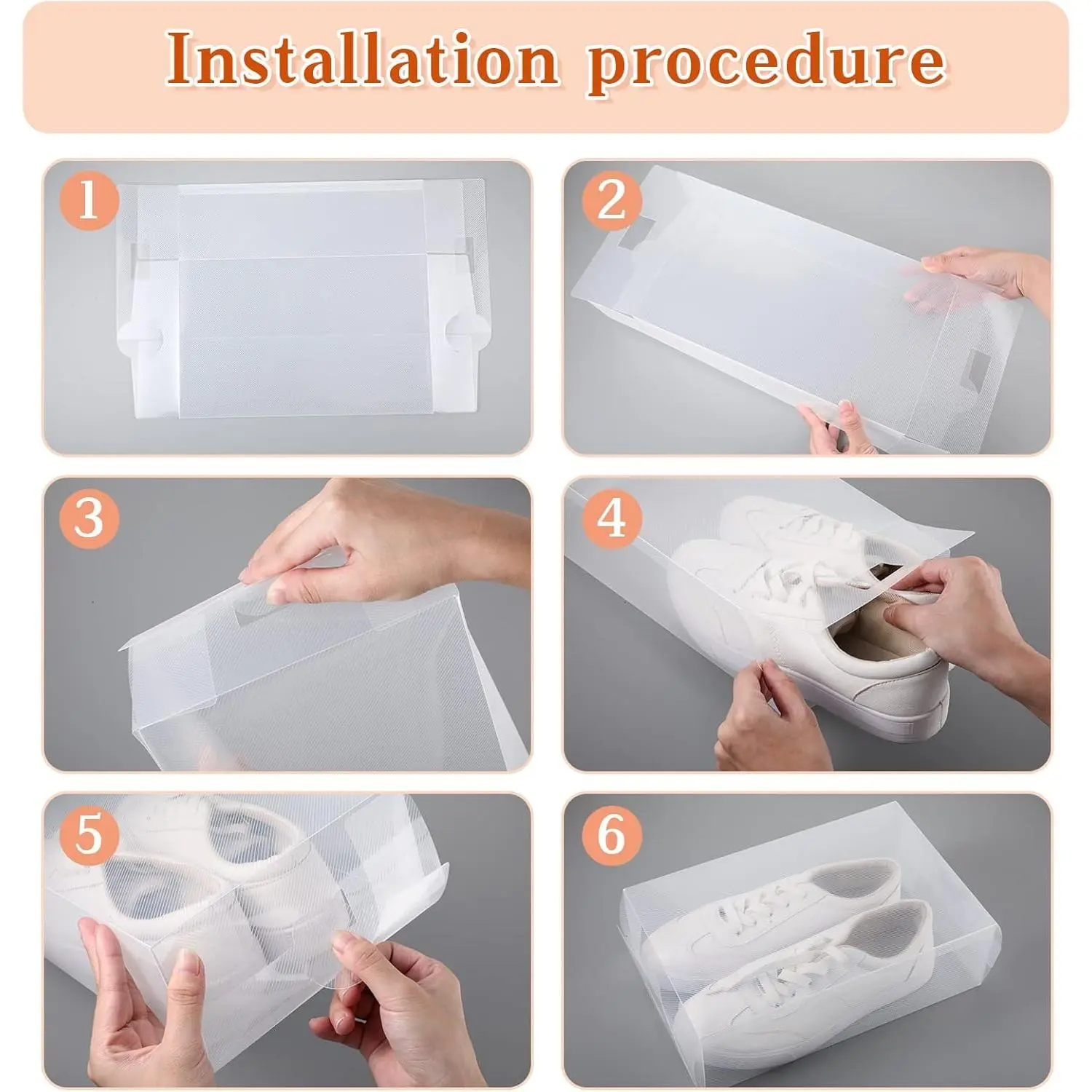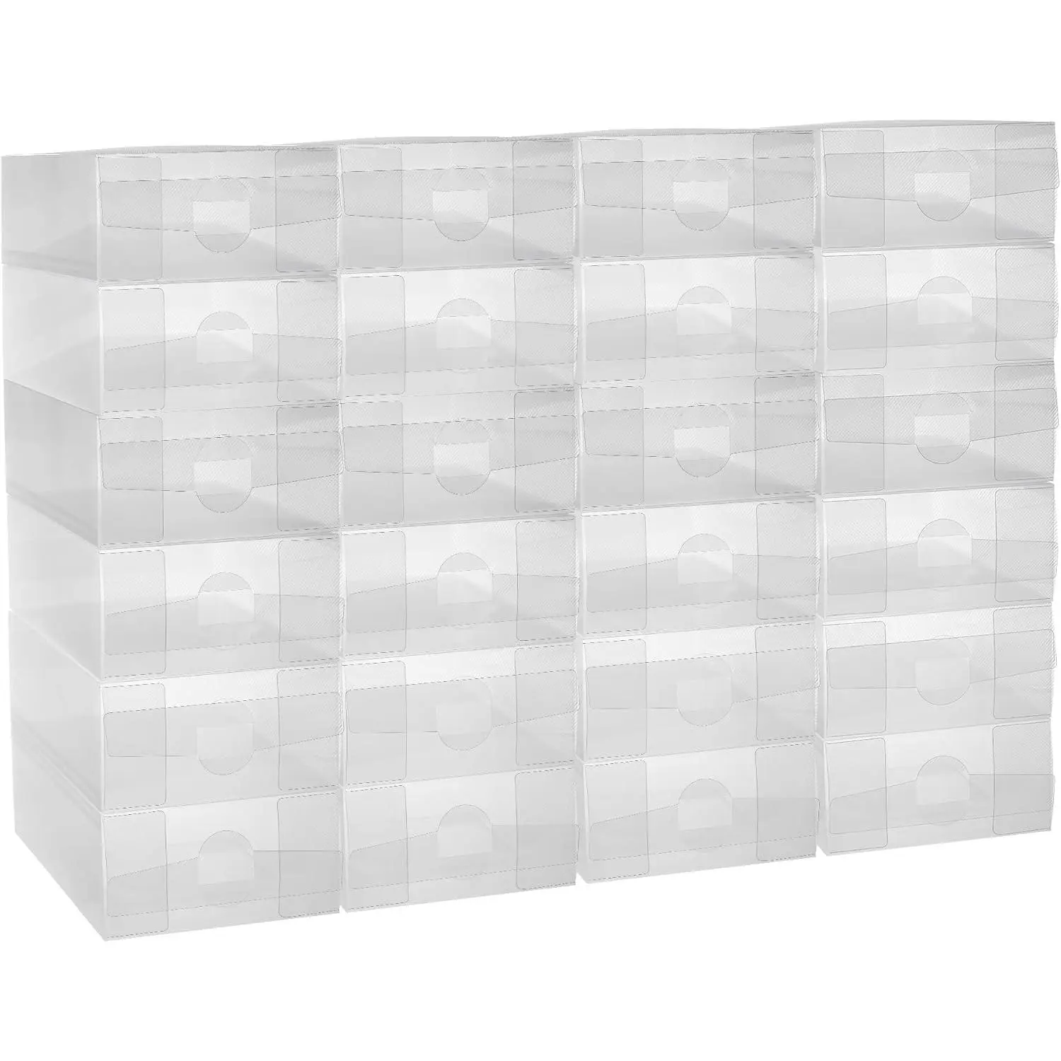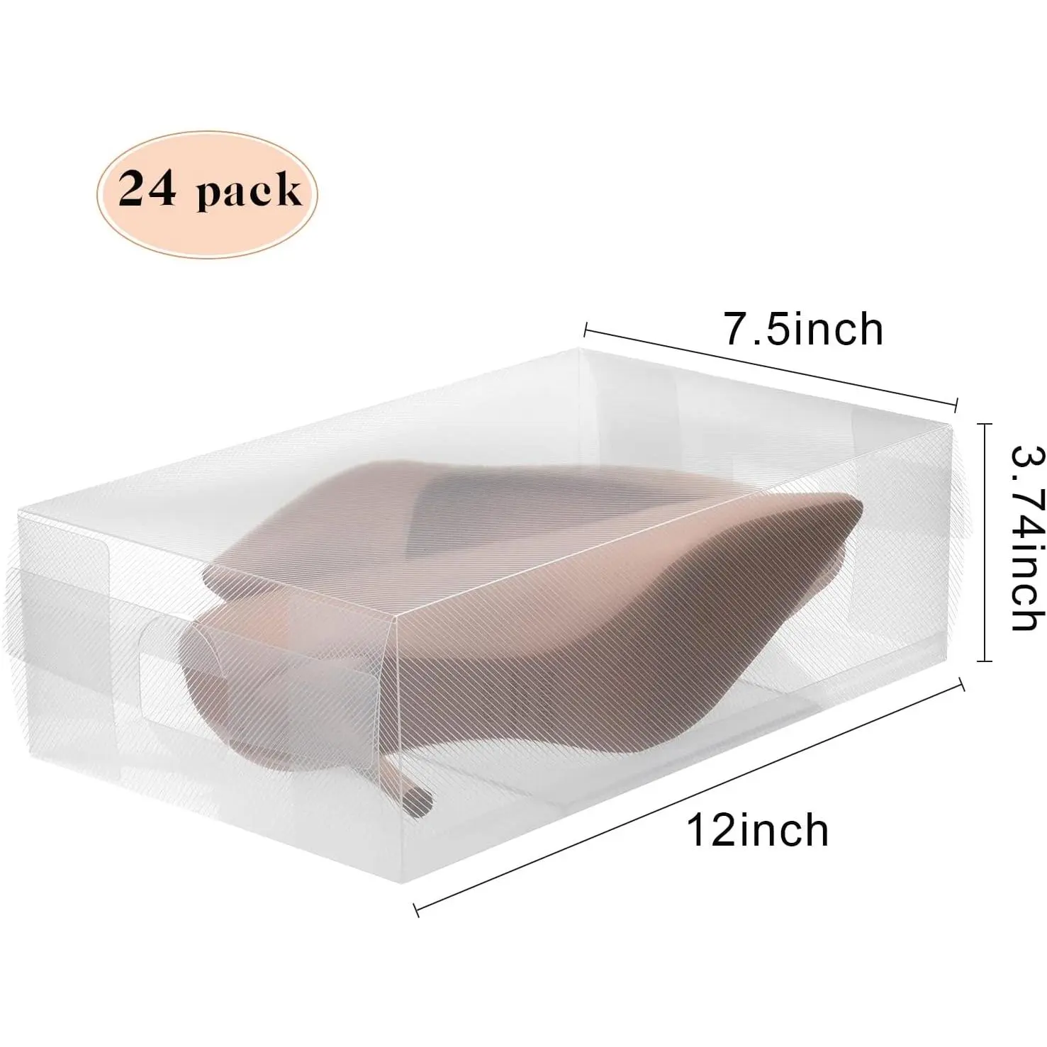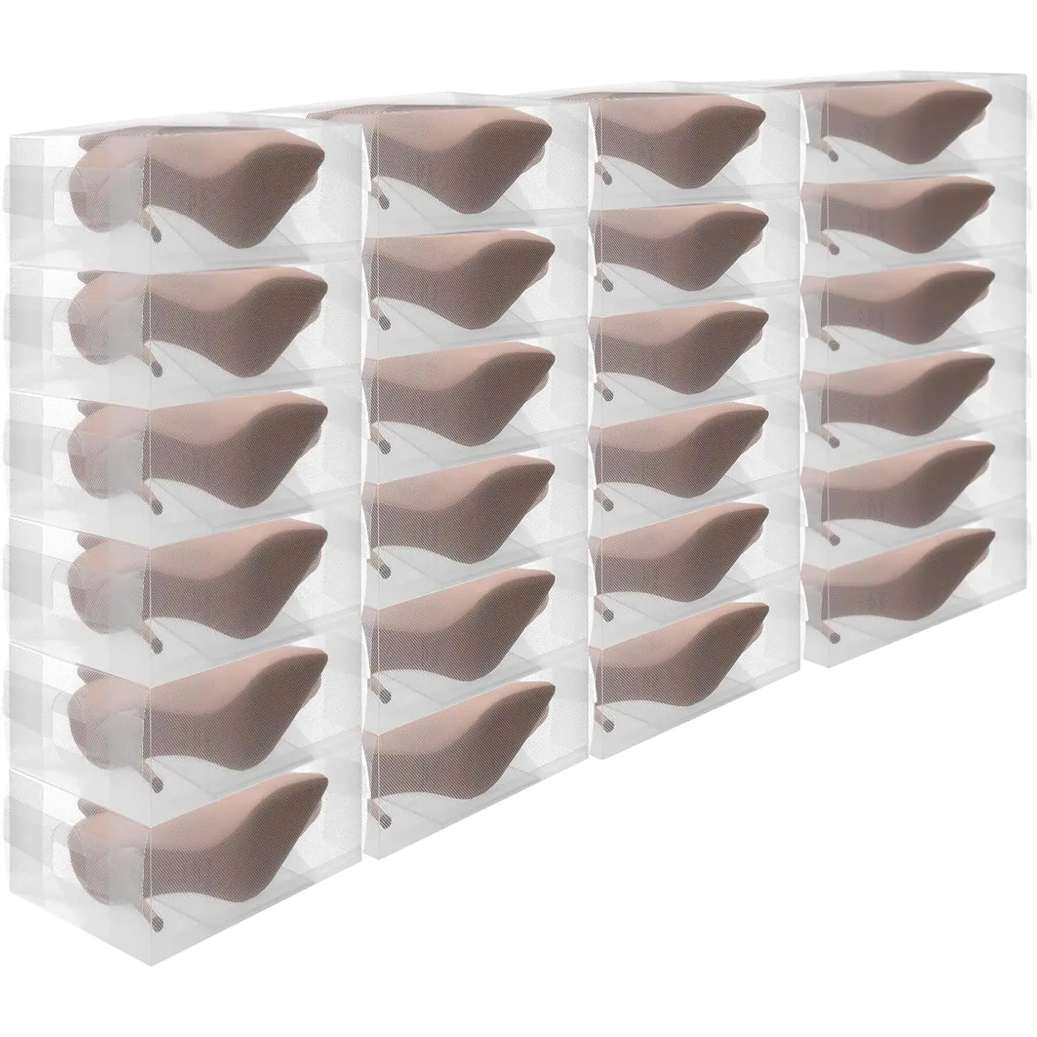 Rich in Quantity: you will receive 24 pieces of shoe storage boxes, simple but large, enough quantity and capacity for you to use or place in daily life, and the clear plastic casing makes it easy to identify the contents, so you can quickly find what you need, bringing you a nice using experienceProper Size: the plastic shoe organizer is about 12 x 7.5 x 3.7 inches, appropriate sizes suitable for most womens shoes, convenient to carry and store without occupying much space, you can stack it up and put it in the doorway, closet, shelf or other places, which can save much space for youFoldable Shoe Containers: the individual shoe storage boxes are easy to install, and you can fold them up when not in use, suitable for high heels, cotton shoes, hiking boots, sneakers, dress shoes, slippers, sandals and more, which can keep them away from dust and wetQuality Material: the clear shoe organizer is made of quality plastic material with fine workmanship, lightweight and sturdy, no toxicity and no nasty smell, resistant to breakage and chipping, breathable and waterproof, which can keep your shoes in an ideal condition, offering you long serving timeVersatile Stackable Box Set: the stackable shoe organizer is ideal for your home, office, hotel, living room, bedroom, dorm, apartment and many other places, which can not only be applied for various shoes, but also for toys, clothes, towels, books or many other items, which can make the room clean and tidy