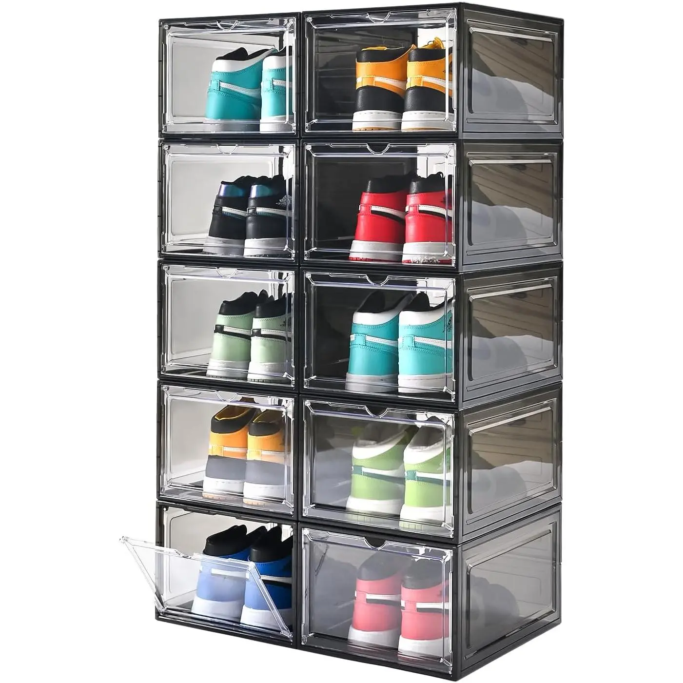 and stackable: The shoe storage box adopts a simple interlock design, each stackable shoe box can be connected together, and will not fall when tilted; These drop-front shoeboxes are stackable for easy shoe organization.