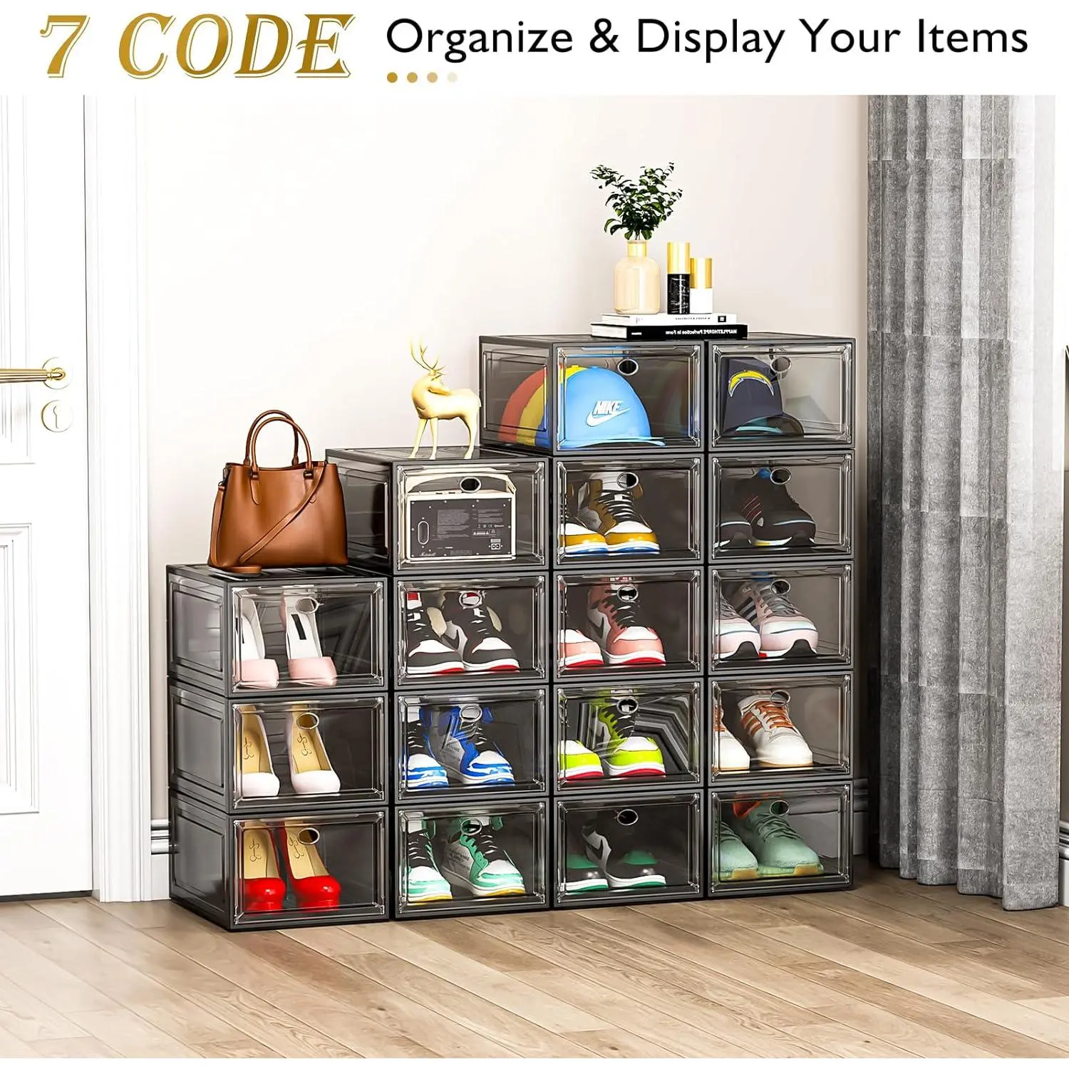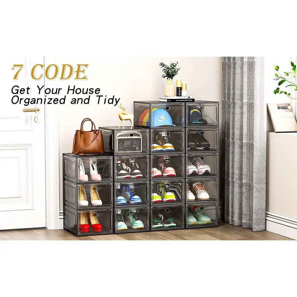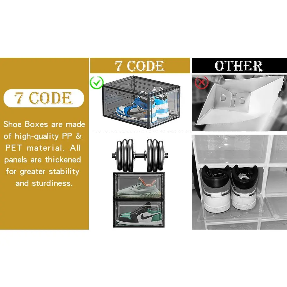 ✔Transparent, Stackable Shoe Boxes - Our 7code shoe boxes feature a transparent magnetic door and a robust stackable design. Made with thick material for extra durability, they ensure a stable, slip-free setup. Easily connect and stack using side and top pins.