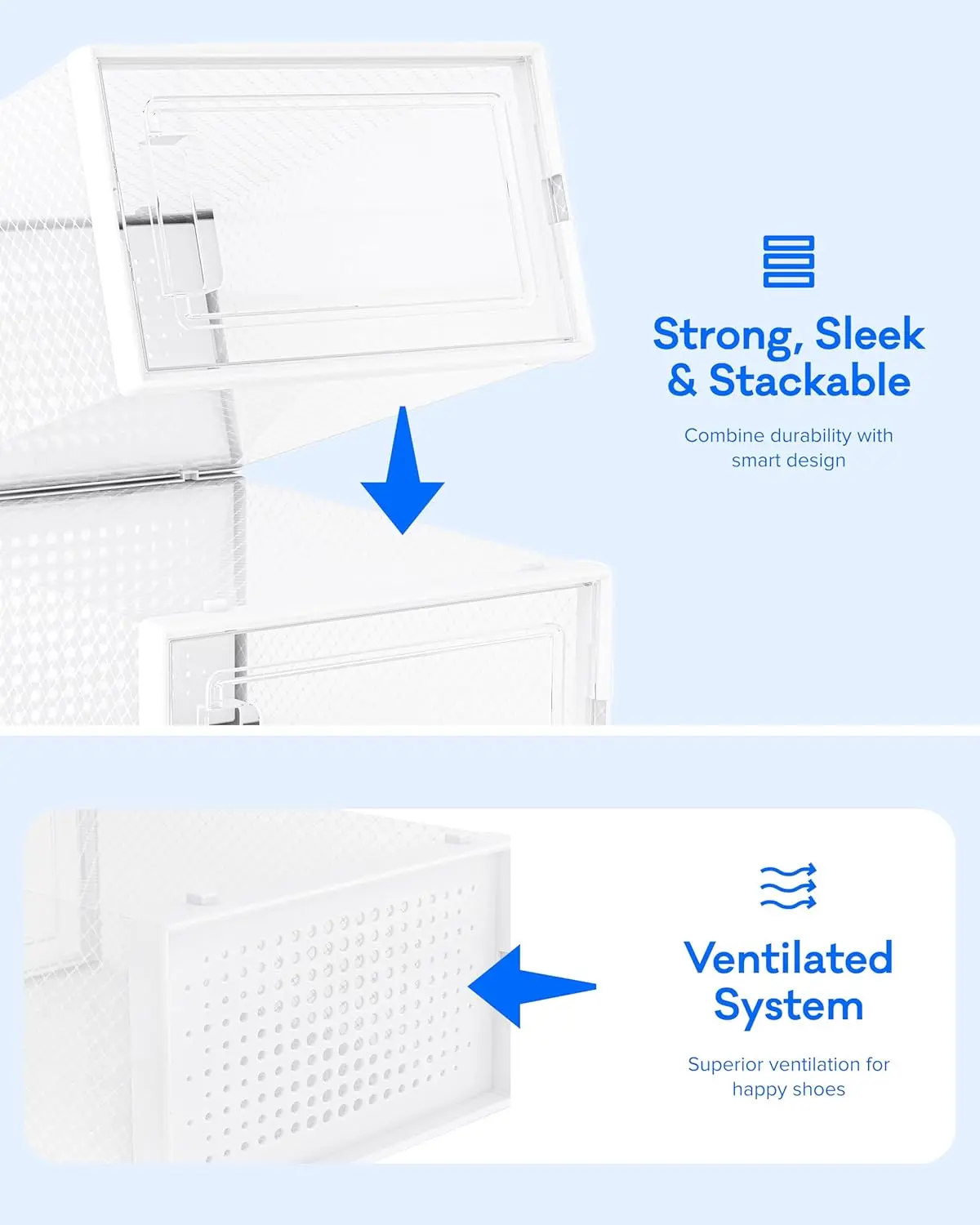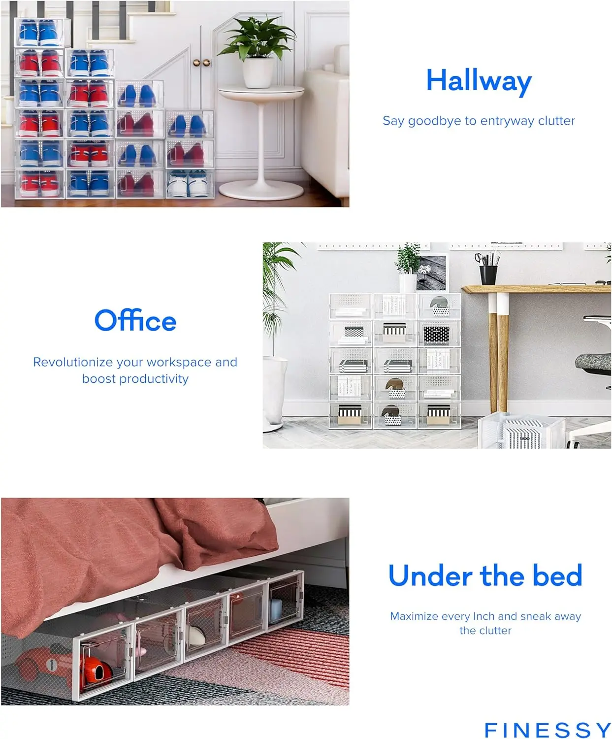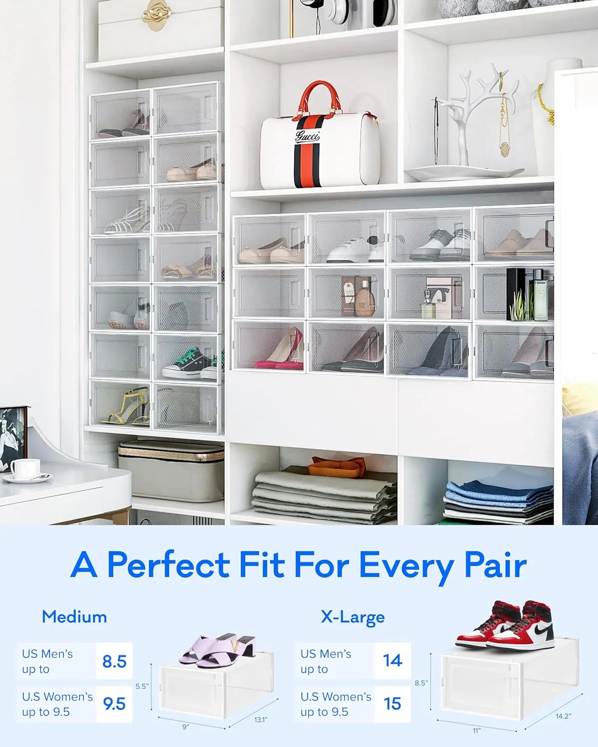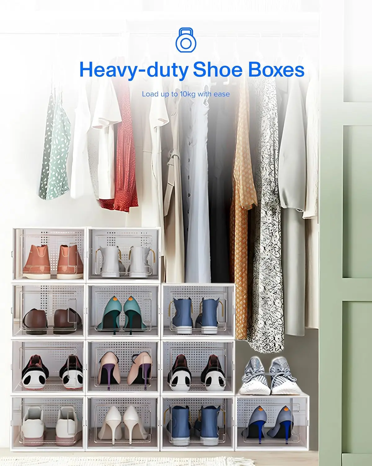 Find Your Sole Mate in Seconds: No more sifting through cluttered piles. Our 12-pack plastic shoe boxes with lids feature a clear, see-through design, allowing you to quickly spot and access the perfect pair of shoes.