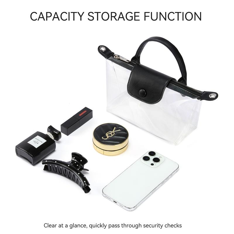 This is cute but also I think is over priced. I with Longchamp had this clear version. But this will do, the handle is a little crooked so I have to hang it on the door knob to straighten it out.