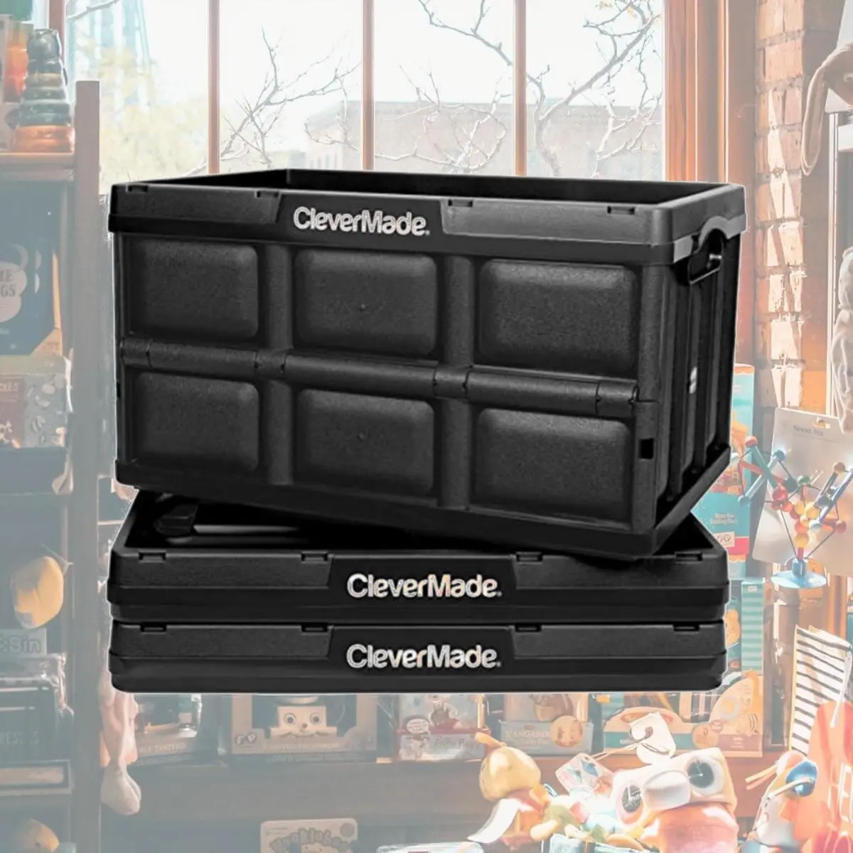 Containers can be used around the home, office, dorm, RV, or on shelves in the garage; great for sporting equipment, tool, or food organization; perfect boxes for moving. To collapse, simply push from the bottom of the short sides to make the bins quickly fold flat; crates can be vertically stacked up to 3 high when open or closed with their interlocking nesting system design. Features CleverMade, 46L, Collapsible Storage Bin, Black, PDQ. Specifications Capacity: 46L . Height: 9.0". Width: 15.0". Length: 21.5". Country of Origin: Italy. Weight: 3.44 lbs.