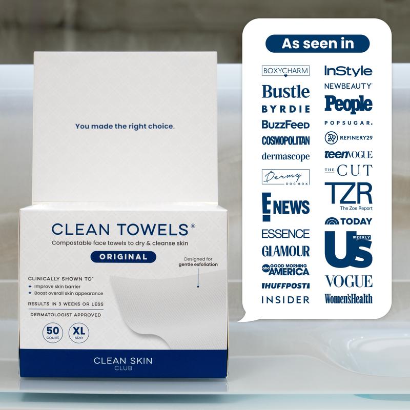 Clean Towels XL are clinically shown to improve 100% of overall skin health. They are the original disposable, ultra-soft, and bio-based face towel, approved by dermatologists. Unlike regular towels, Clean Towels are scientifically designed for optimal skin health. 🌿
