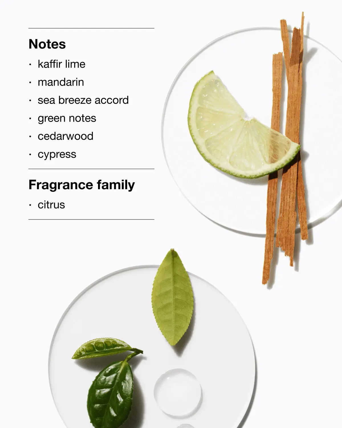 Cool. Crisp. A hint of citrus. A refreshing men’s cologne. Wear it and be happy. Allergy tested. Fragrance Family: Citrus Fragrance Notes TOP NOTES: Kaffir lime, mandarin MIDDLE NOTES: Sea breeze accord, green notes BASE NOTES: Cedarwood, cypress
