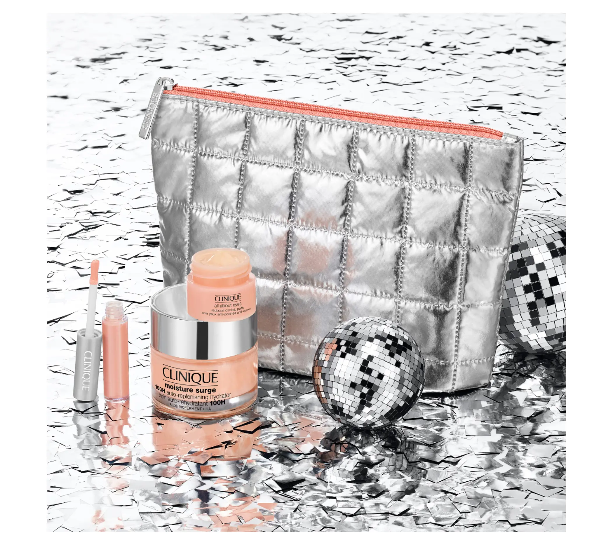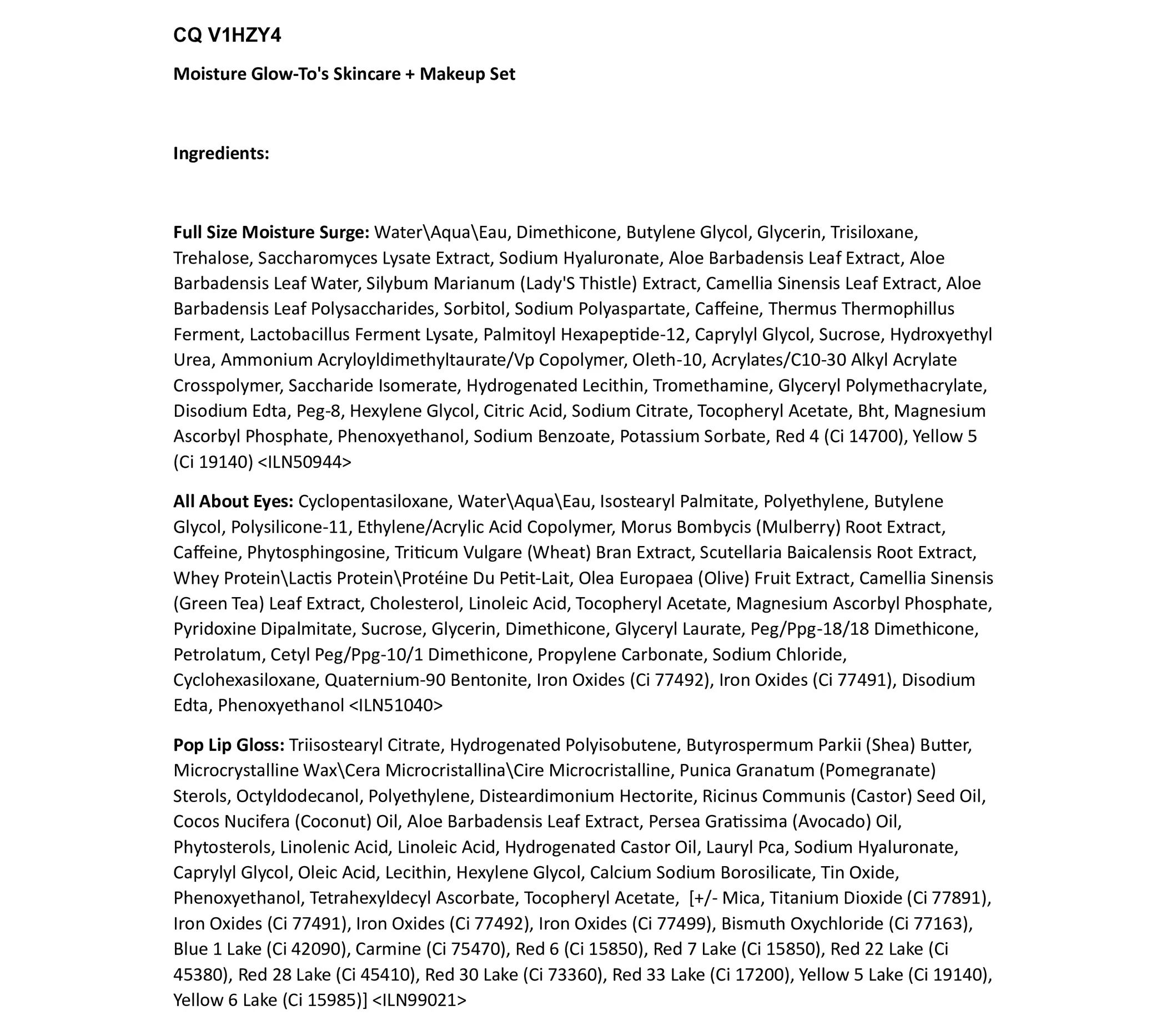 | Ingredients | Offers Skin Services Discover Home / All Gifts & Sets Moisture Glow-To's Skincare + Makeup Set (1) Read Reviews $55.00 1 Add To Bag Shop now and pay later with 4 payments of $13.75 Shop now and pay later with 4 payments of $13.75 A trio of skincare and makeup essentials to leave you glowing all season long. A $82.00 value. Allergy tested. 100% fragrance free. Please note: This product is excluded from discounts. Ingredients: Water\Aqua\Eau,Dimethicone,Butylene Glycol,Glycerin,Trisiloxane,Trehalose,Saccharomyces Lysate Extract,Sodium Hyaluronate,Aloe Barbadensis Leaf Extract,Aloe Barbadensis Leaf Water,Silybum Marianum (Lady'S Thistle) Extract,Camellia Sinensis Leaf Extract,Aloe Barbadensis Leaf Polysaccharides,Sorbitol,Sodium Polyaspartate,Caffeine,Thermus Thermophillus Ferment,Lactobacillus Ferment Lysate,Palmitoyl Hexapeptide-12,Caprylyl Glycol,Sucrose,Hydroxyethyl Urea,Ammonium Acryloyldimethyltaurate/Vp Copolymer,Oleth-10,Acrylates/C10-30 Alkyl Acrylate Crosspolymer,Saccharide Isomerate,Hydrogenated Lecithin,Tromethamine,Glyceryl Polymethacrylate,Disodium Edta,Peg-8,Hexylene Glycol,Citric Acid,Sodium Citrate,Tocopheryl Acetate,Bht,Magnesium Ascorbyl Phosphate,Phenoxyethanol,Sodium Benzoate,Potassium Sorbate,Red 4 (Ci 14700),Yellow 5 (Ci 19140) Rds Product Name: All About Eyes Division: Cl (Clinique)Ingredients: Cyclopentasiloxane,Water\Aqua\Eau,Isostearyl Palmitate,Polyethylene,Polysilicone-11,Ethylene/Acrylic Acid Copolymer,Morus Bombycis (Mulberry) Root Extract,Phytosphingosine,Triticum Vulgare (Wheat) Bran Extract,Scutellaria Baicalensis Root Extract,Whey Protein\Lactis Protein\Protéine Du Petit-Lait,Olea Europaea (Olive) Fruit Extract,Camellia Sinensis (Green Tea) Leaf Extract,Cholesterol,Linoleic Acid,Pyridoxine Dipalmitate,Glyceryl Laurate,Peg/Ppg-18/18 Dimethicone,Petrolatum,C |