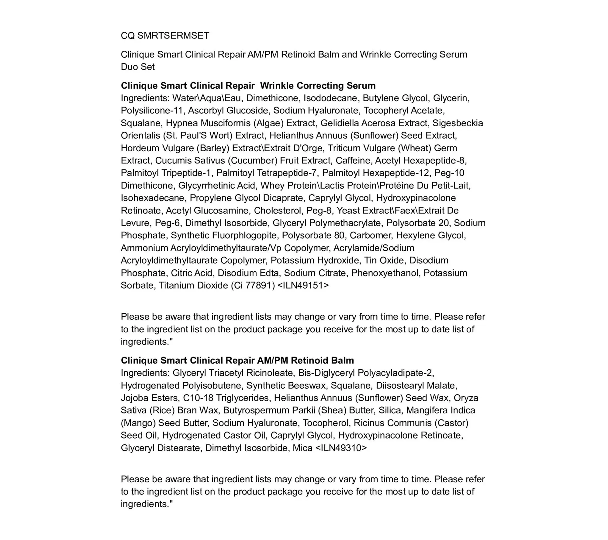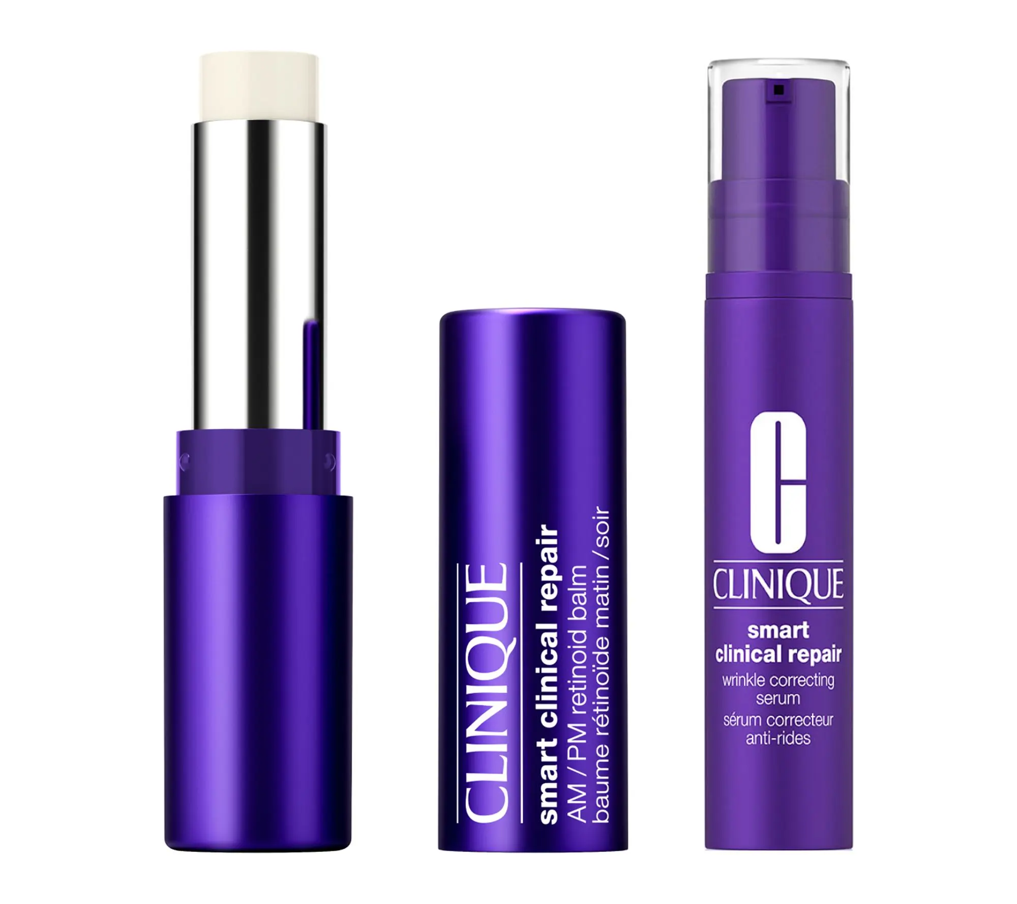 Clinique Smart Clinical Repair Wrinkle Correcting Cream: What it Is: Our anti-aging beauty cream helps temporarily improve the look of lines and wrinkles. Clinique Smart Clinical Repair Wrinkle Correcting Cream helps temporarily improve the look of lines and wrinkles. Helps Leaves skin looking smoother. formulated with ingredients to hydrate, which helps temporarily minimize the appearance of fine, dry lines. Lightweight, cream texture How to Use: Use Clinique's wrinkle cream twice a day, morning and night. Apply to face and neck after using Clinique Smart Clinical Repair Wrinkle Correcting Serum. Follow with Clinique Smart Clinical Repair Wrinkle Correcting Eye Cream for our ultimate de-aging routine. Always include SPF as the last step in the AM. Clinique Smart Clinical Repair Wrinkle Correcting Eye Cream is our eye cream. What It Is: Our anti-aging beauty eye cream for wrinkles helps temporarily improve the look of the eye-area skin, making it appear smoother and younger-looking. Product Details: Undereye cream delivers temporary hydration. Silky texture. How to Use: Apply around eye area, gently massaging into skin. Use twice a day, morning and night. Clinique Smart Clinical Repair Retinoid Balm and Serum Duo Set Clinique Smart Clinical Repair Wrinkle Correcting Serum: Clinique's most advanced anti-aging beauty serum Helps temporarily improve the look of wrinkles. Product Details Clinique Smart Clinical Repair Wrinkle Correcting Serum is our serum for fighting wrinkles. Hydrates skin and helps minimizes the appearance of fine, dry lines. How to Use: Use our face serum for anti-aging twice a day, morning and night. Step 1: Dispense 1 to 2 pumps onto fingertips. Step 2: Spread all over clean face and neck, avoiding eye area. Step 3: Follow with your favorite Clinique Smart Clinical Repair moisturizer. Tips Daily sunscreen(not included) is imperative. Apply to face and neck in the AM after your moisturizer. Limit sun exposure while using and the week after. Do not use TRUNCATED: SEE ADDITIONAL INFO IN PCP