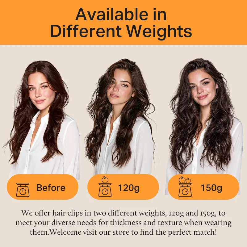 【Wearing Advice】120g clip-in extensions are perfect for thin hair or a natural volume boost, offering moderate thickness for everyday wear. 150g clip-in extensions add more volume and length, ideal for those needing fuller styles or thicker hair.You can purchase according to your needs.