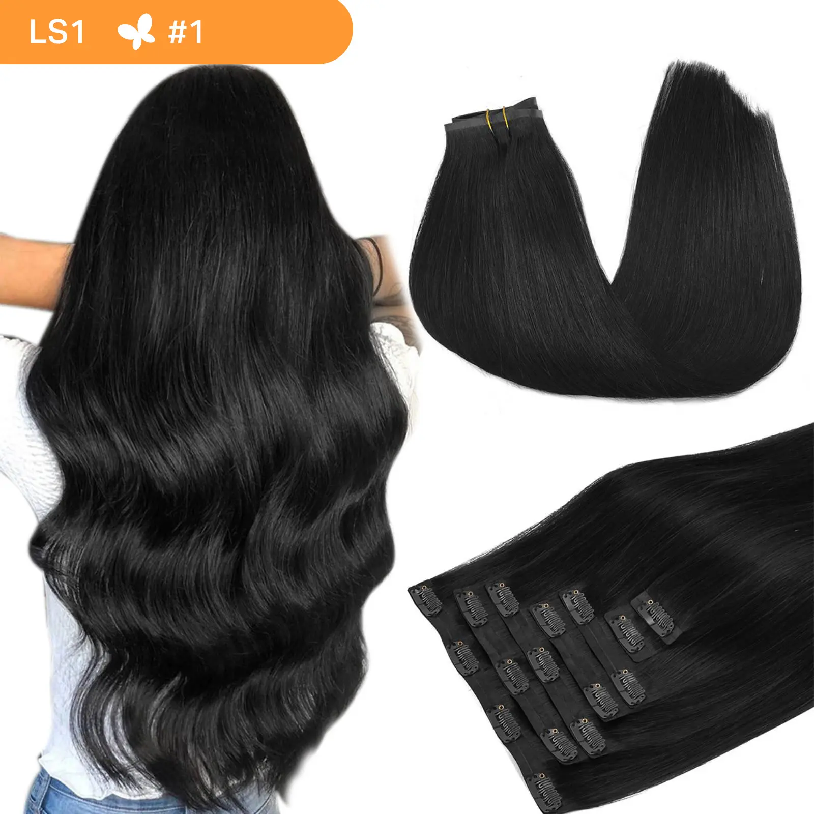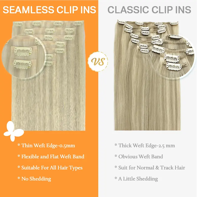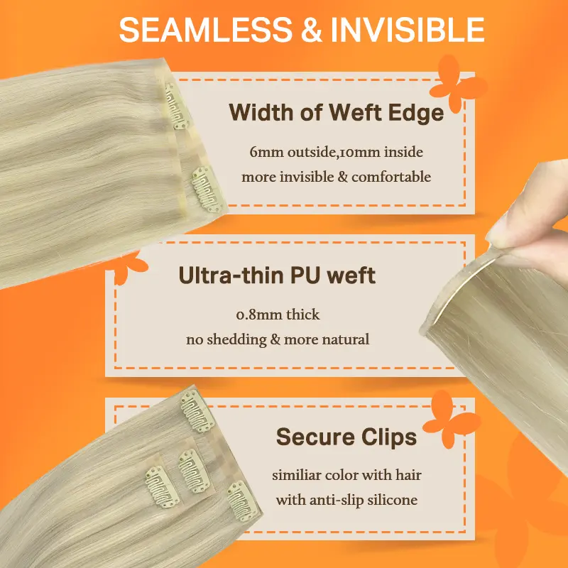 ·【Skin Weft PU Clip in Hair Extensions--Invisible & Comfortable & Lighter】 --Unlike traditional sew weft clip hair extensions, our new PU clip hair extensions press the hair on the PU with the clips, which make the hair extensions more invisible, comfortable,natural, and lighter. The PU design fits your scalpmore invisibly, looks closer to the skin color. The outer PU part on each piece is shorter than the inner PU part, so it can be more invisible.