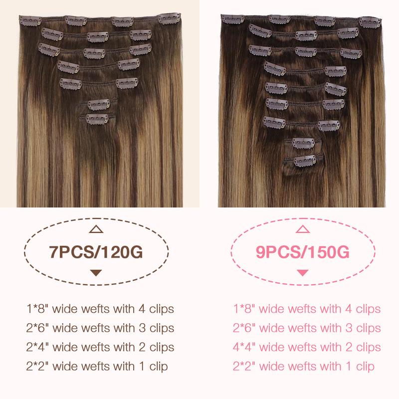 ·【9pcs&7pcs Clip in hair extensions】7Pcs for 120g, 9Pcs for 150g. Each hair extension offered in weights of 120g and 150g for selection, you can choose different specifications according to your needs. Perfect for a natural thickness boost with 1-2 sets, or achieve a full, voluminous look with 2-3 sets.