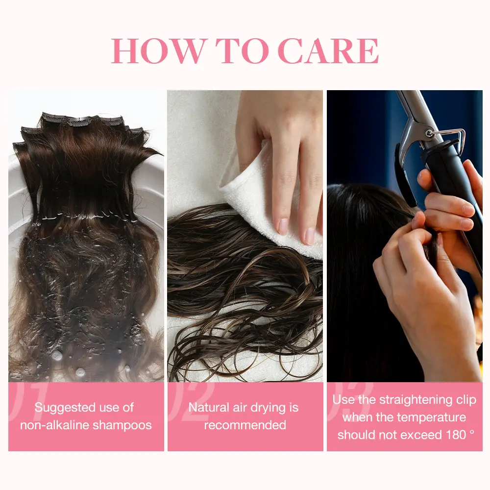 Heat Styling Guide: To preserve the quality and longevity of your 100% human hair extensions, we recommend using heat tools at a maximum temperature of 180°C (356°F). For best results, avoid applying direct heat to the same section for more than 5 seconds at a time.