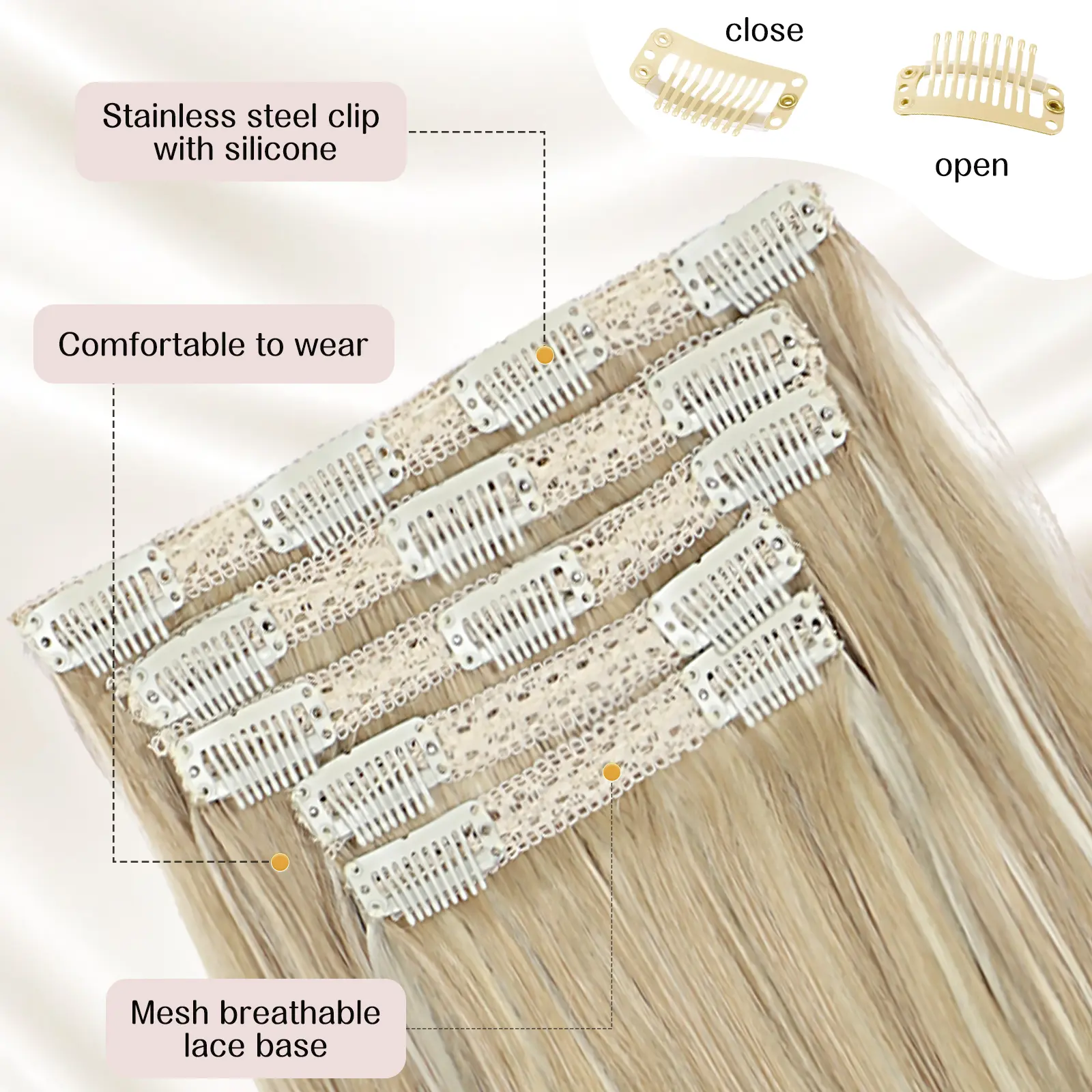 The hair is very close to mine except more yellow. The picture showed a more platinum color. That’s the only downfalls are the clips might be too bulky for thin hair and it does get tangled easy and is hard to brush when clipped in.