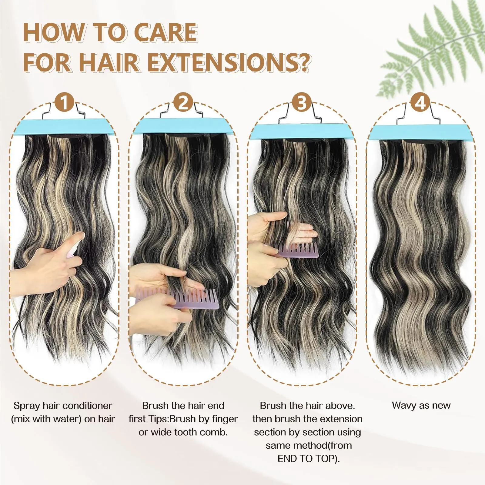 ·Care Tips : Unlike the real human hair, the synthetic hair may get tangled without nutrition.To prevent it ,kindly you can get a spray bottle then fill it up with water.Spray it in the hair extensions.Then use an anti-static comb to comb from the end of the hair extension.