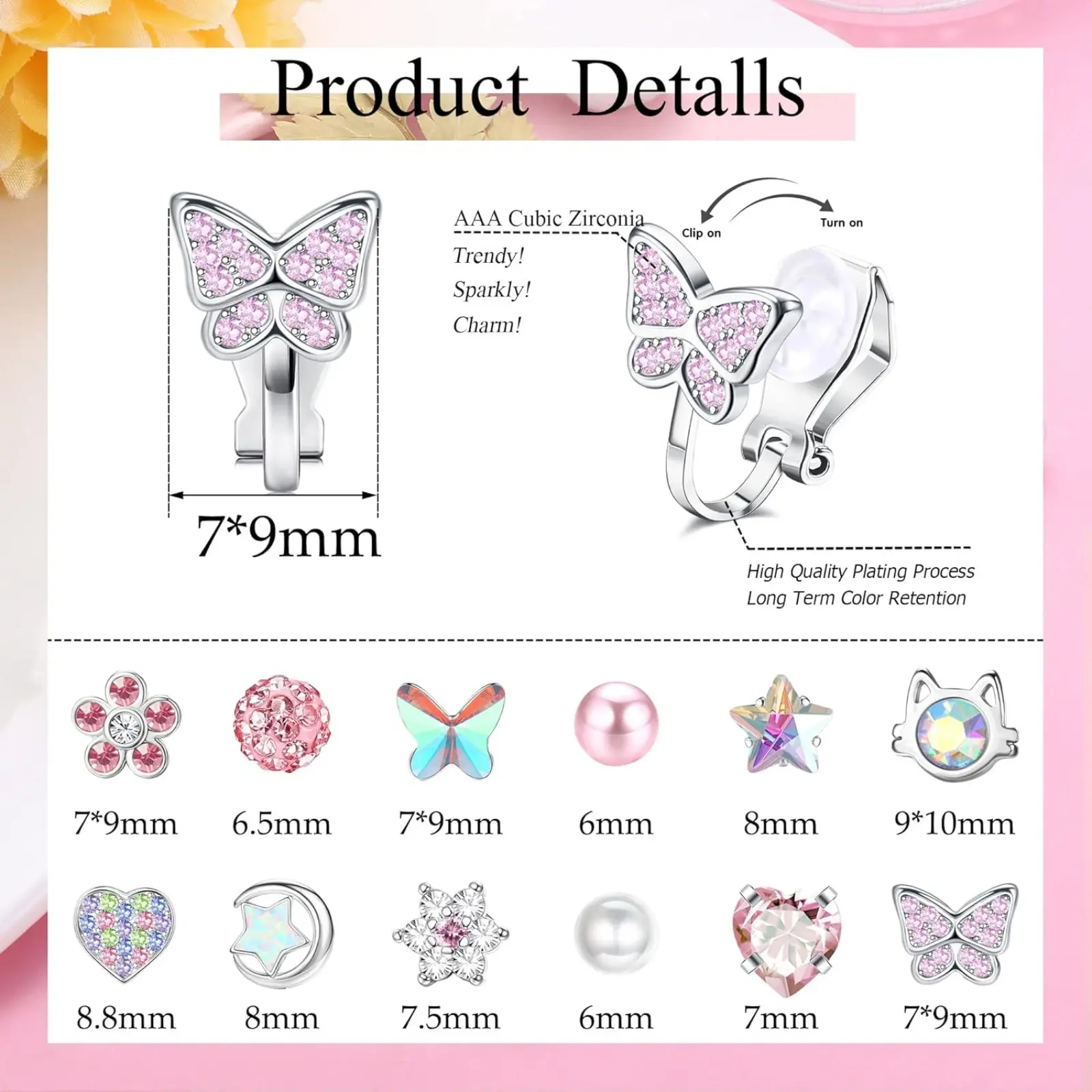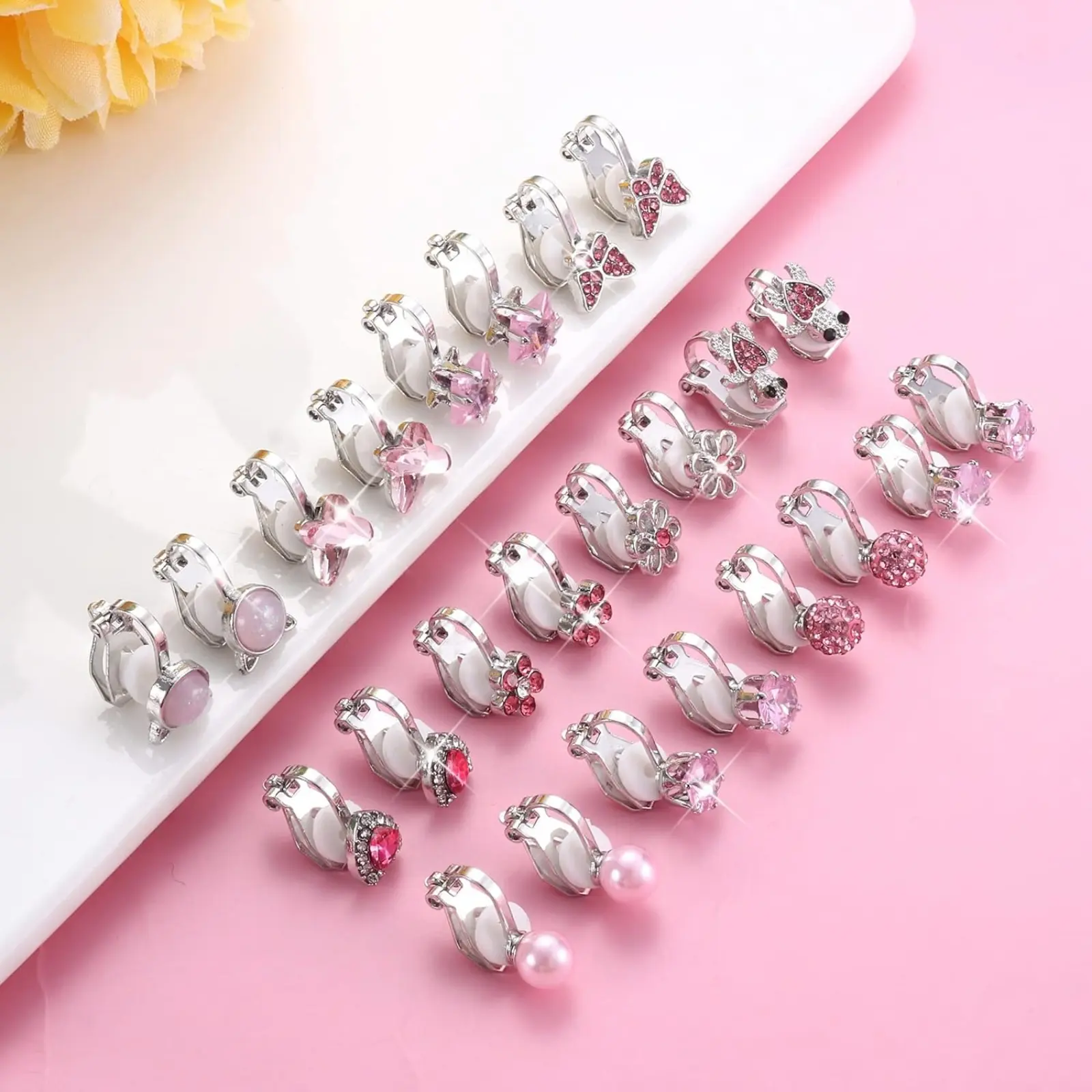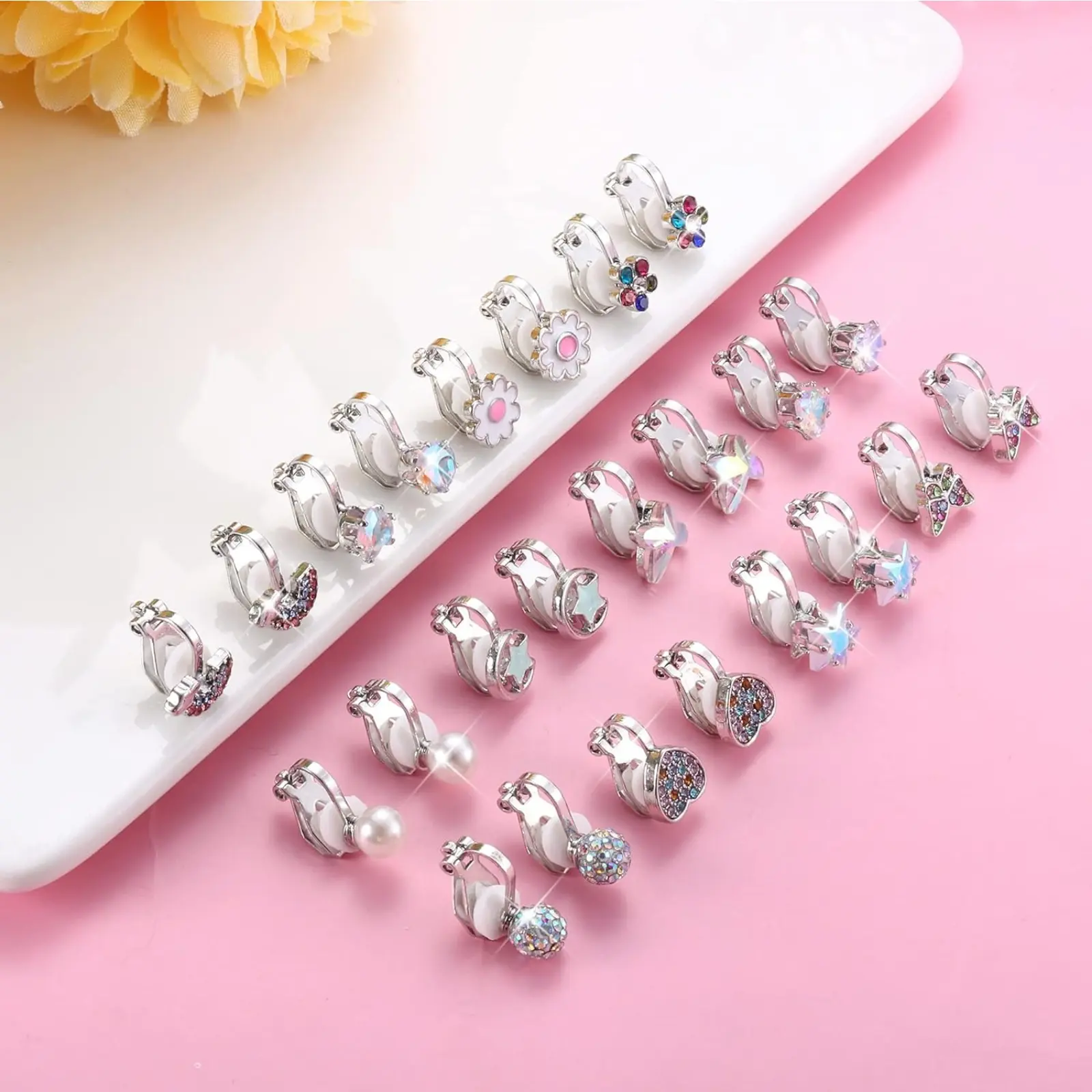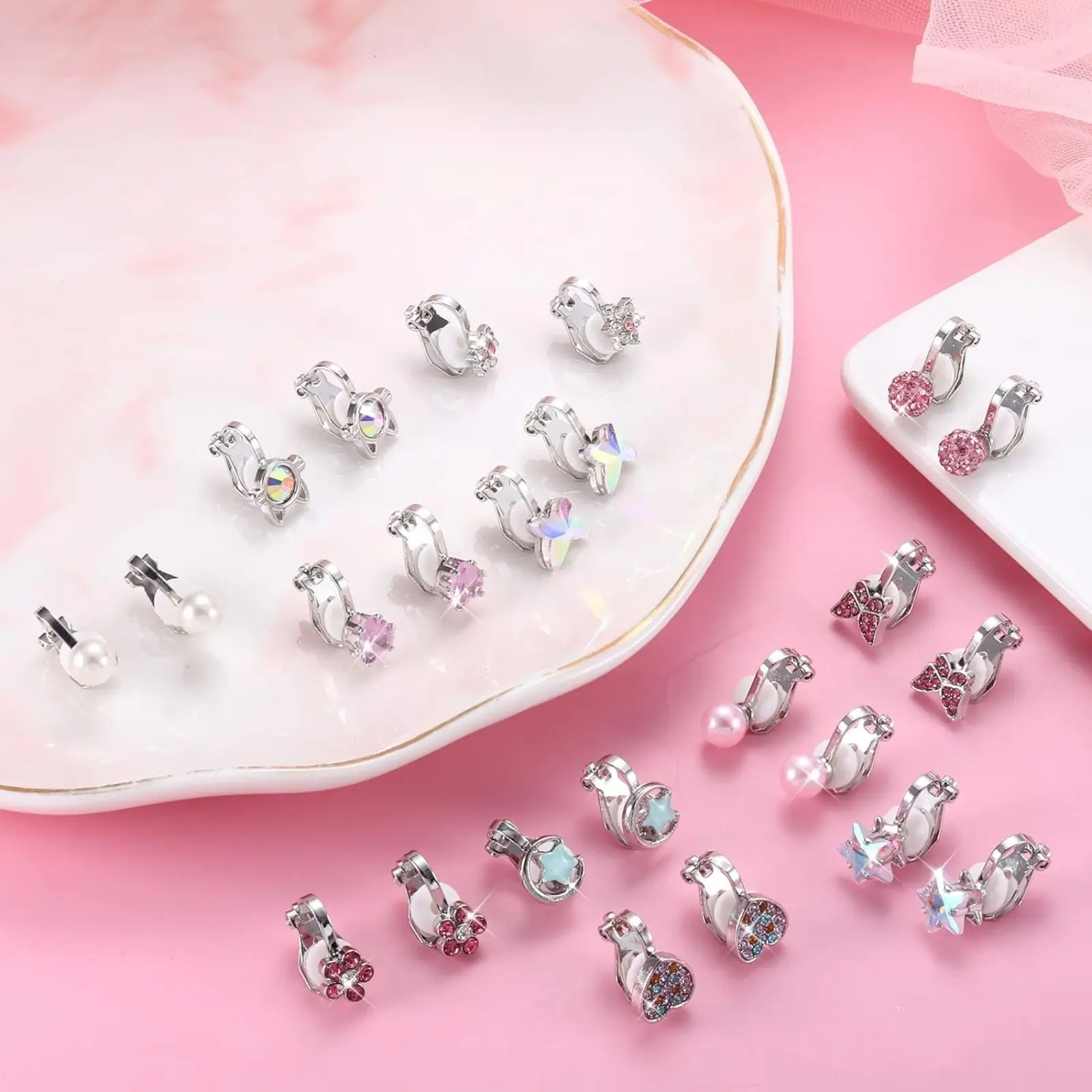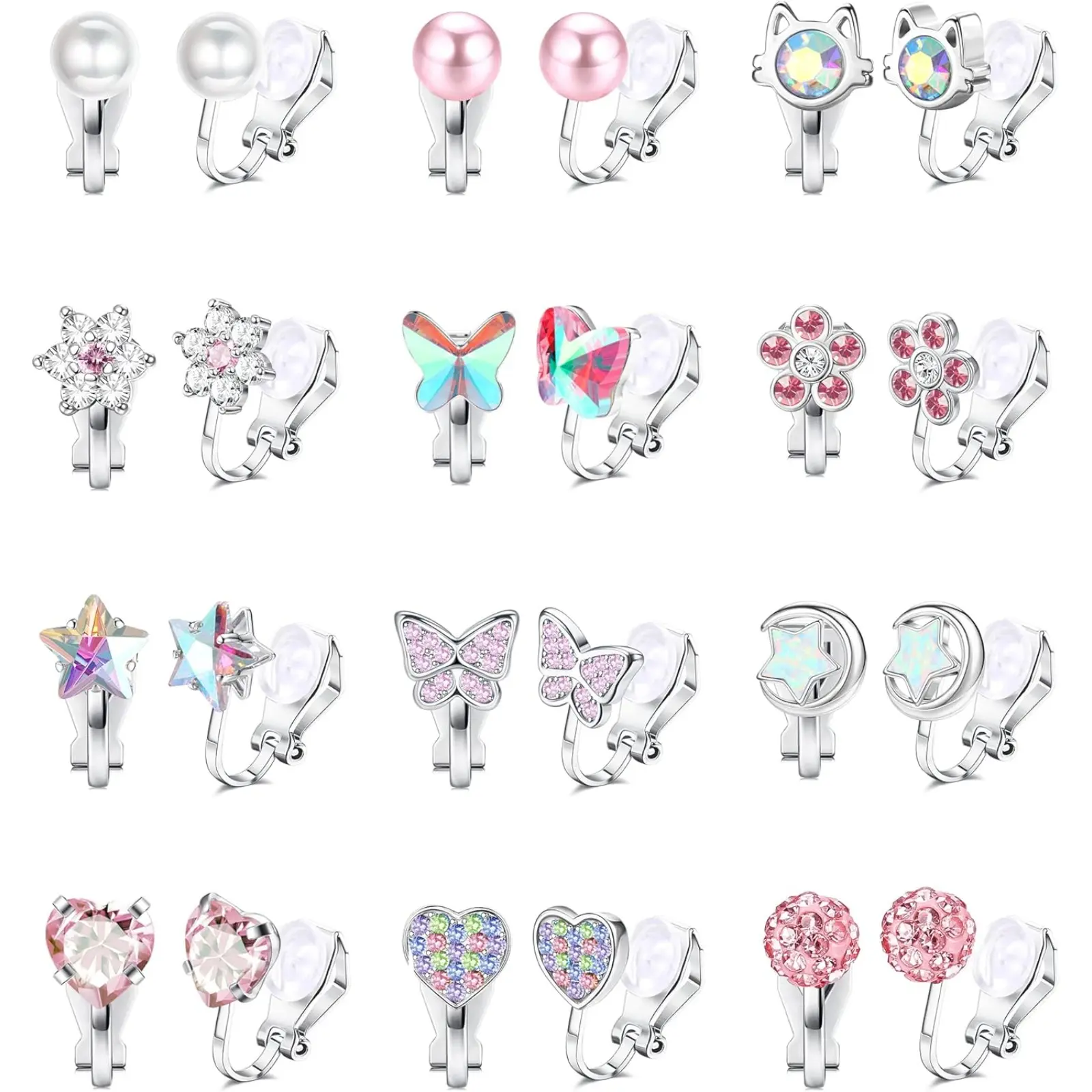 ·CUTE CLIP ON EARRINGS: 12 Pairs clip on earrings for women with different styles. Bling and adorable design for your choice, Mixed with pearl earrings, heart earrings, butterfly earrings, flower earrings, star earrings, animals rainbow clip earrings, etc. These beautiful earring clips can easily match any clothes, whether it is a dress, or T shirt jeans.