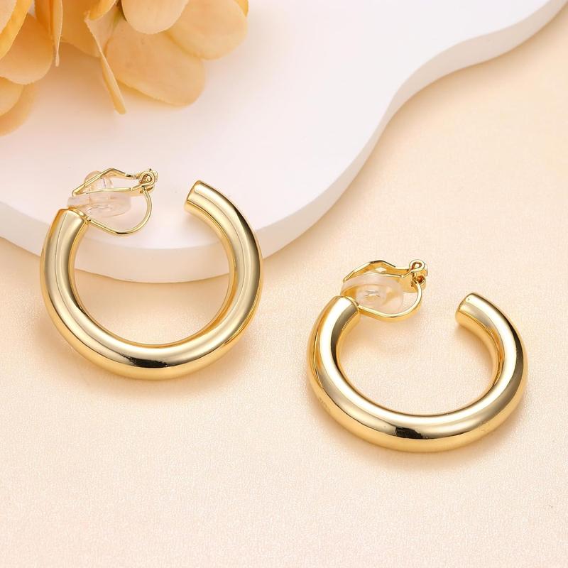 ·SAFE COMFORT: Chunky hoops clip on earrings are crafted with high quality 14K real gold plating, lead and nickel free, hypoallergenic; High polished ensuring a long-lasting; Don't worry about tarnish or fade over time; Each clip on earring comes with two pairs of detachable silicone ear pads cushions for comfortable wear and easy replacement