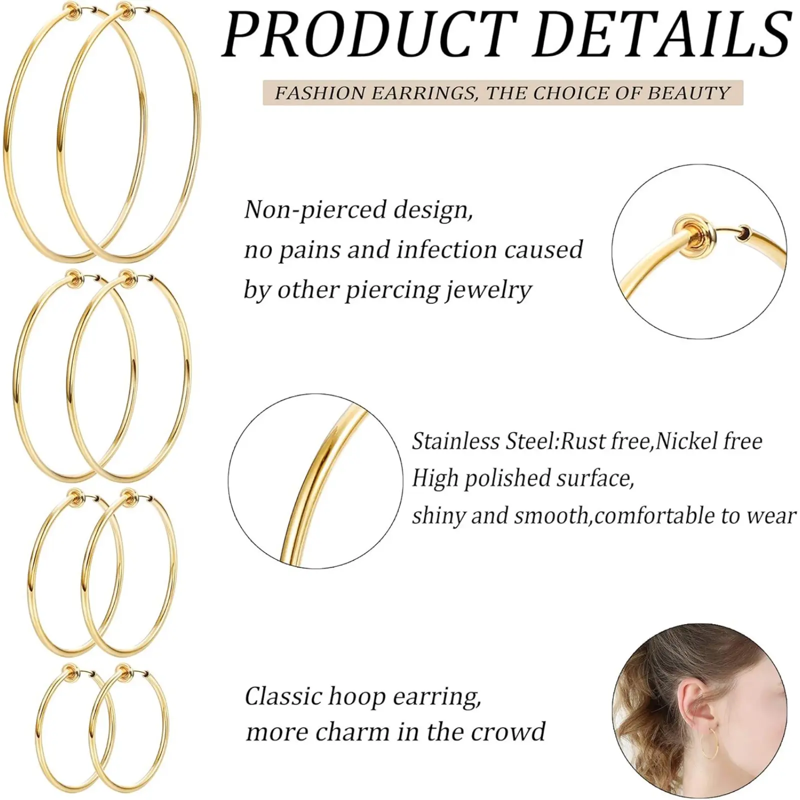 ·CLIP ON HOOP EARRINGS: One Order You Can Get 4 Pairs Fake Hoop Earrings, Great Value for You,These Fashionable Spring Hoop Earrings are Specially Designed for People Who Without Pierced Ears, They Will Help You Enjoy the Fun of Wearing Earrings.