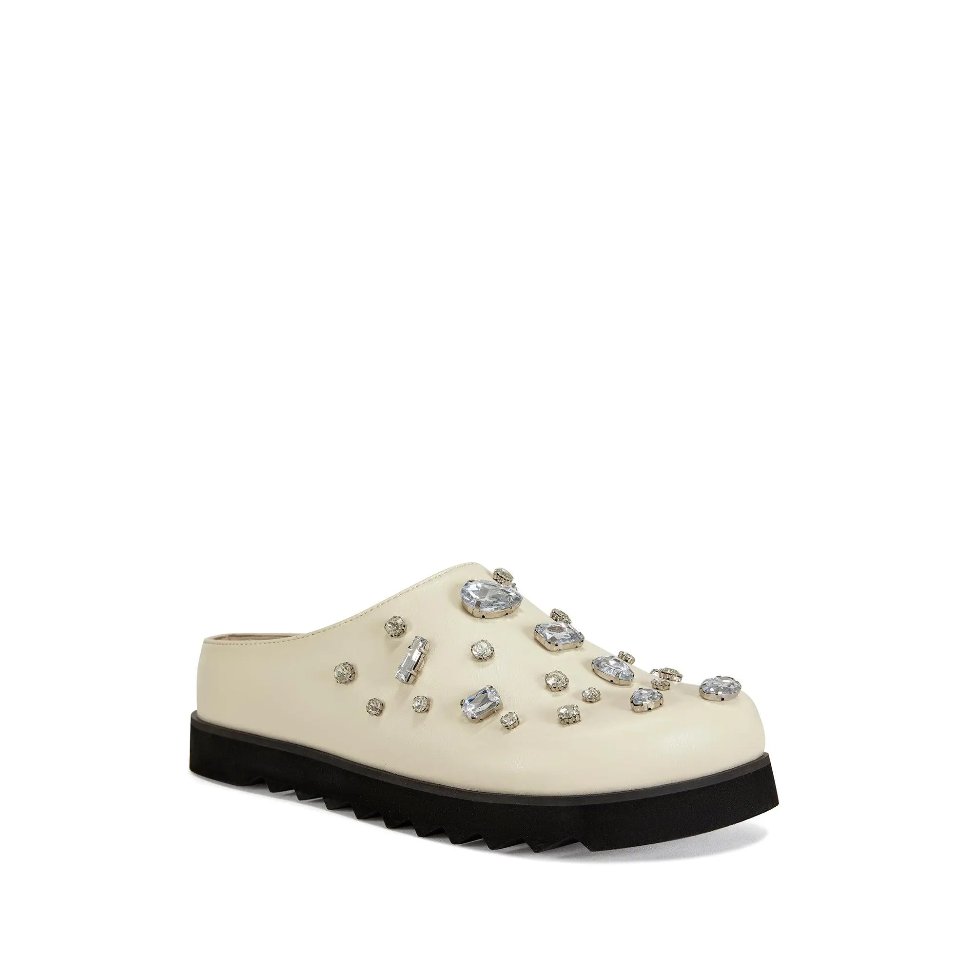 The Voncile in cream is a faux leather slip on with a black ridged sole. Its chunky rhinestones elegantly adorn the upper, adding a touch of glamour to any outfit. Step out in style with your elevated casual looks featuring this clog.