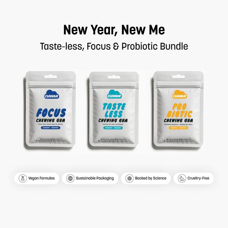 New Year, New Me Bundle is designed to support better choices, balanced wellness, and sharper focus—one chew at a time, with Tasteless Gum, support gut and metabolic balance with Probiotic Gum, and stay clear-headed and focused with Focus Gum—powered by Rhodiola and Vitamin B6, no caffeine needed.