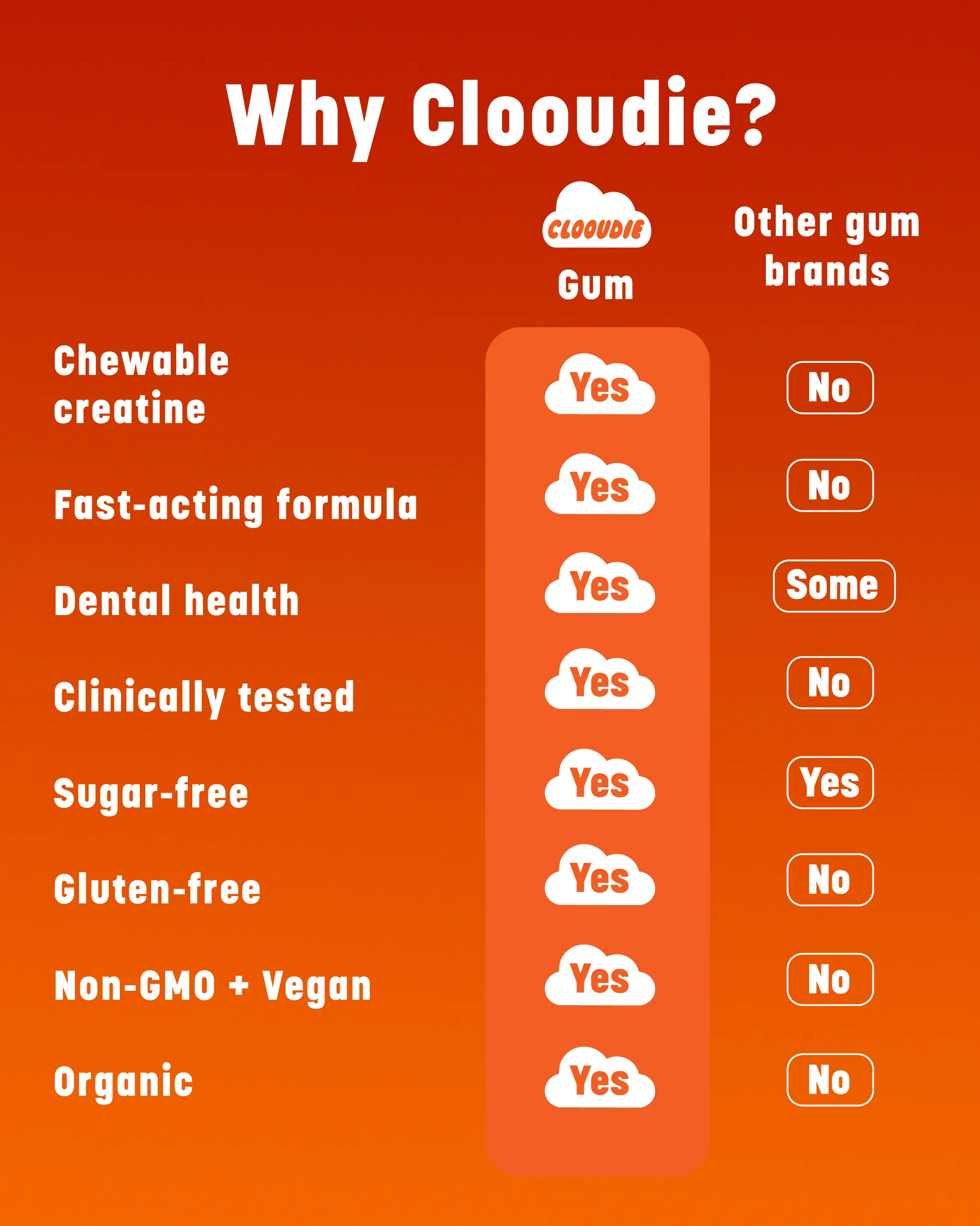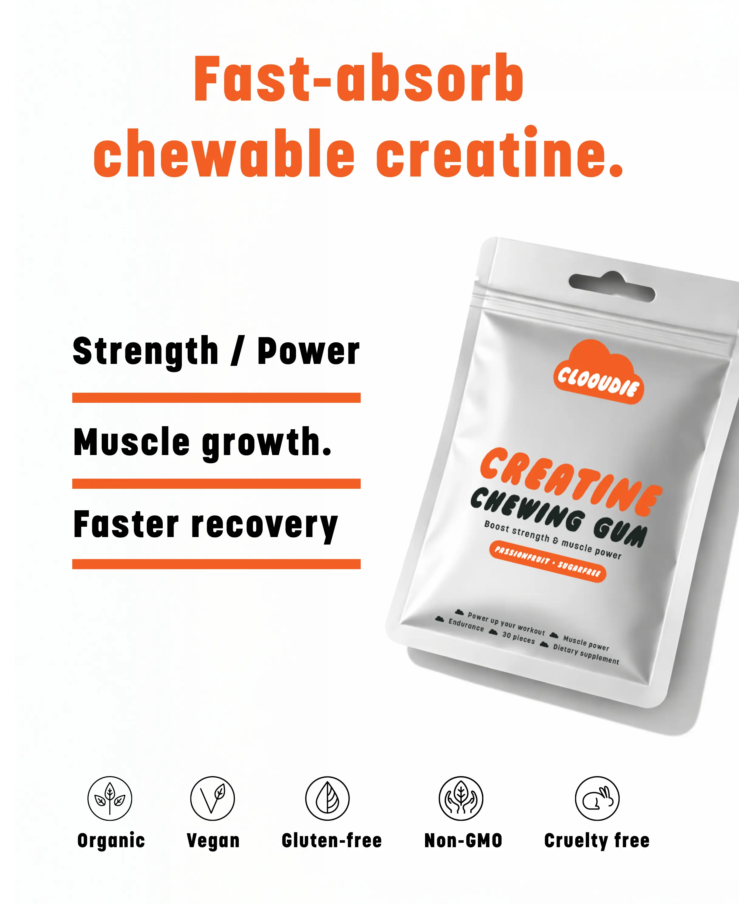 Clooudie Creatine Chewing Gum delivers creatine monohydrate in a convenient chewable format, designed to support your workout strength, performance and endurance, support energy system and muscle growth, and help recovery when combined with regular exercise. No blender. No green juice. Just chew and go.