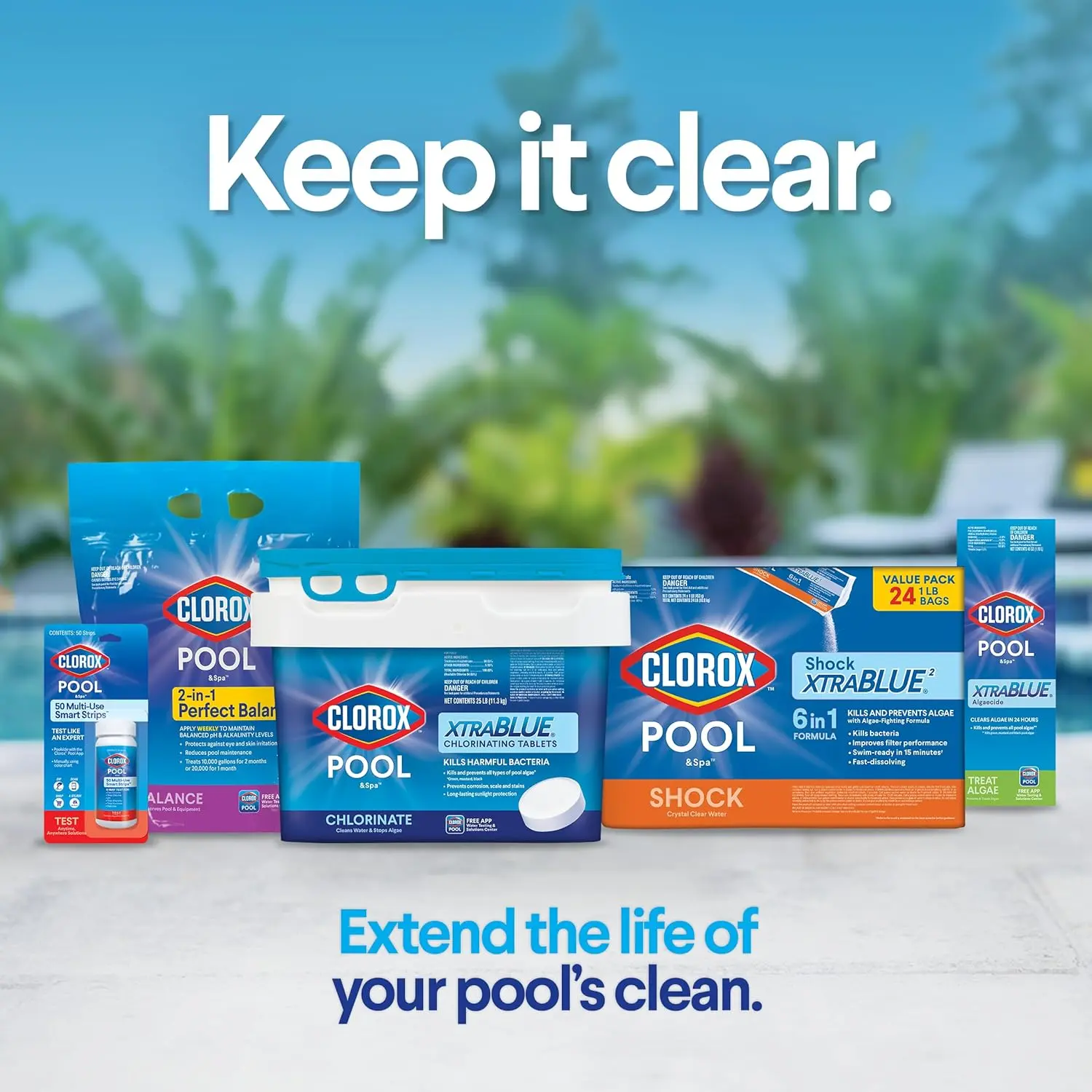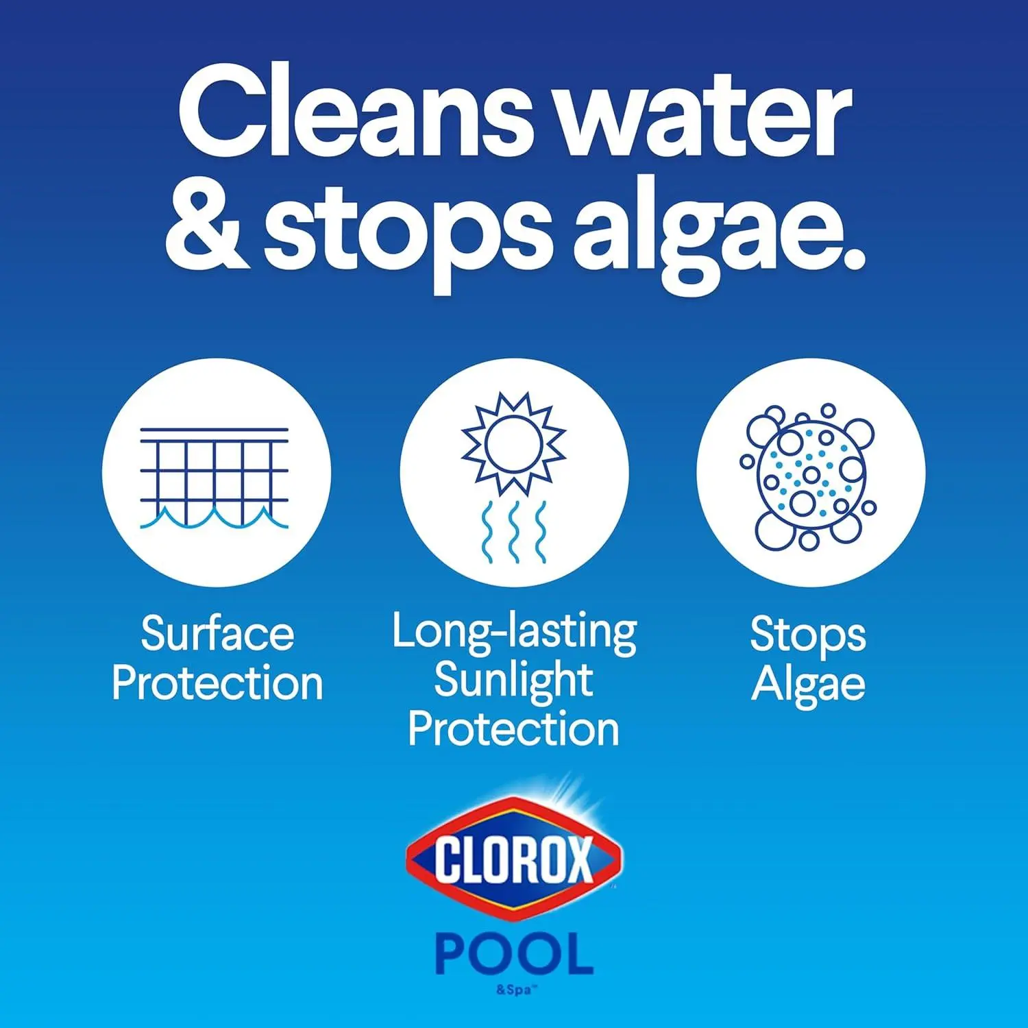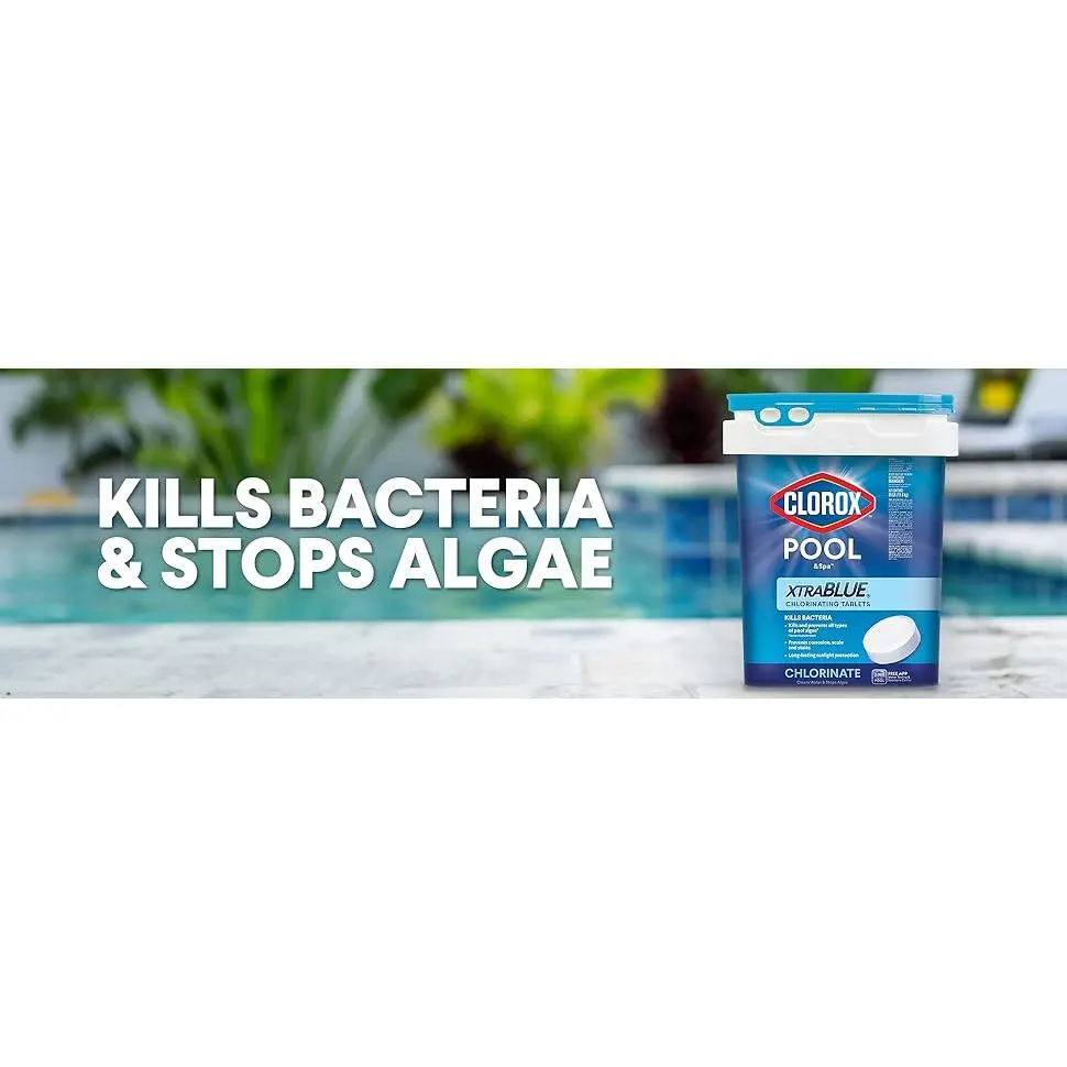 Cleans Water & Stops Algae: Kills harmful bacteria and prevents equipment corrosion, scale and stains.Kills and prevents all types of swimming pool algae (green, mustard, black)Long-lasting sunlight protection: Contains chlorine stabilizer to extend the life of your cleanCreates Silky Smooth Feeling Water: XTRABLUE chlorinating tablets contain conditioners for silky smooth feeling waterUsage: Apply 2 tablets weekly to treat 10,000 gallons of water, add more tablets as needed to maintain adequate sanitation.Safe for all swimming pool surfaces, including vinyl, plaster, fiberglass, and tile.Clorox Pool App: Test like an expert anytime, anywhere with the Clorox Pool App.Solve common swimming pool problems and get personalized product and dosage recommendations