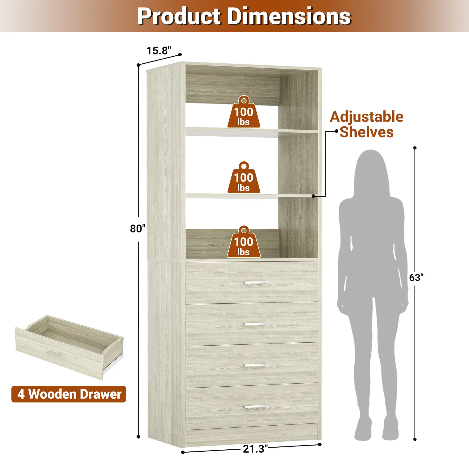Transform tight spaces with this 80" tall storage tower featuring 4 wooden drawers + adjustable shelves (100lb capacity each). At just 15.8" deep, it fits narrow closets while offering ample storage for clothes, accessories, and more. The sleek white finish and elegant handles blend with any decor. Includes anti-tip kit – perfect for bedrooms, nurseries, or offices. Assembles in 30 minutes!