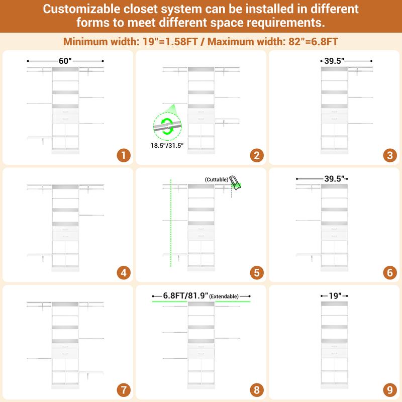·Customizable Closet System - Aheaplus closet system with drawers and shelves is a valuable addition to your nursery organization and walk-in closets. The small modern closet comes with additional cuttable shelves and adjustable hanging rods, designed to fit well in nurseries of varying sizes. Width: 19"–82"