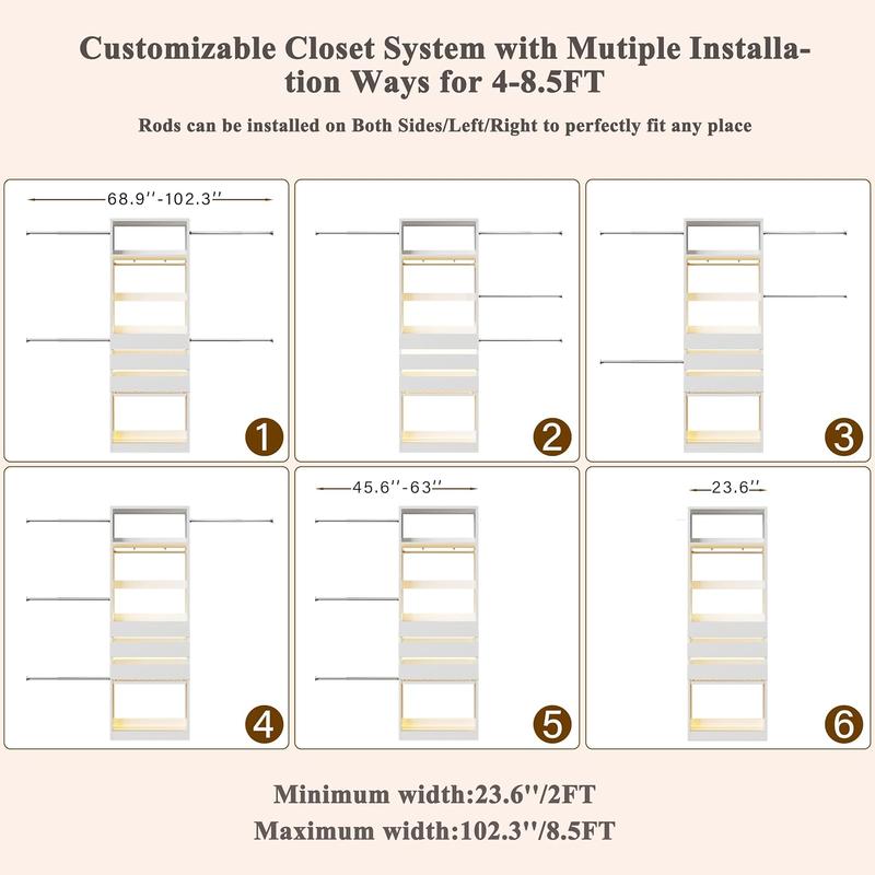 ·All-in-one 4-8FT Closet System: The 102'' closet organizer system is designed with 3 wood drawers, 5 hanging rods, 1 lighting glass top desktop and 1 trouser rack that make it elegant and functional. Expand the hang rods which make this closet system fit 4 to 8 feet, offering customizable storage perfect for any space. It’s the ideal solution for keeping your wardrobe neatly arranged and within reach.