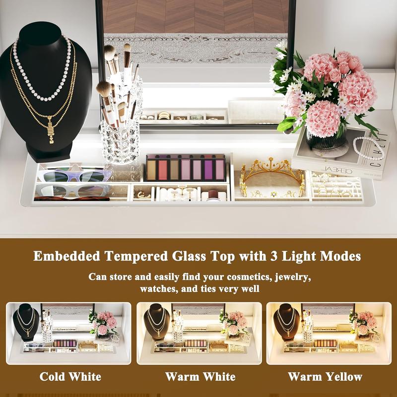 ·Glass Top Closet Organizer System with 3 Drawers: Comes with 3 wooden drawers. The top drawer design with a transparent glass top, which is equipped with 3 light modes LED lights (cold white, warm white/warm yellow), makes your watches, jewelry easy to find. The charming light can also decorate your home and wardrobe with a wonderful atmosphere. 3 wooden drawers perfect to sort some private and small clothes like underwear, socks. All drawers with smooth rails to improve your user experience.