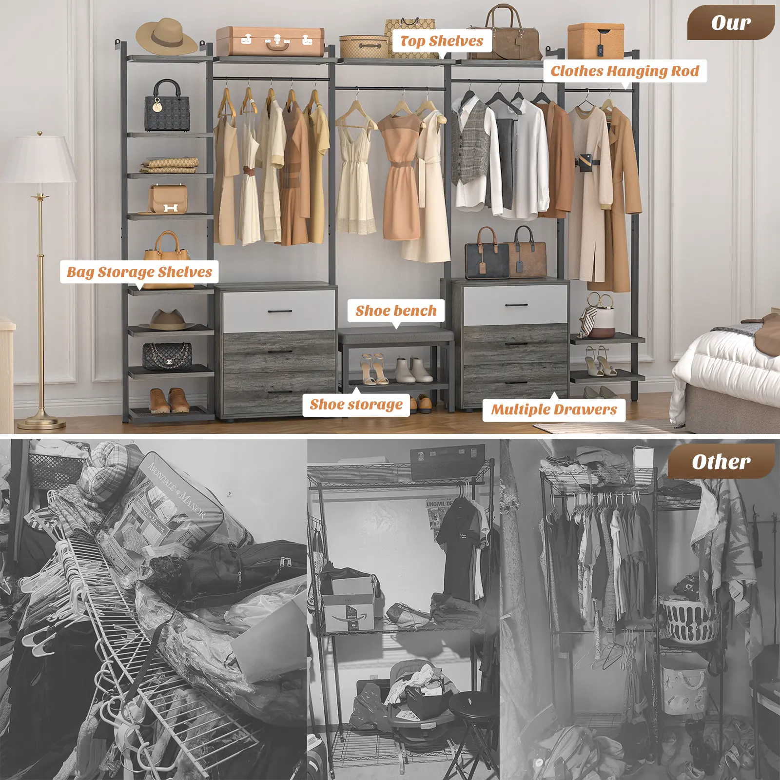 ·【All in 1 Multifunctional Garment Rack with Wood Drawers】This is not only a Closet organizer but also a Dresser and shoe storage rack. Featured with coat rack, wood Drawers, shoe rack, and side shelf, make more storage organized. The Drawers are made of high-quality wood, not the fabric like others, more beautiful and last a long time.