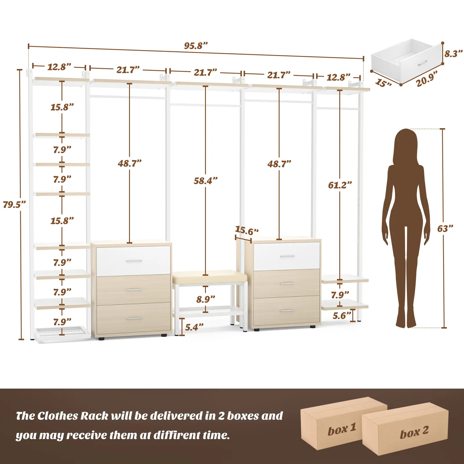 ·【Closet Organizers with Ample Storage Space】Large Closet System Equipped with metal Rods, Storage Shelves and a full row of top storage space. Equipped with metal bars for extra hanging space and shelves to store folded clothing, shoes and accessories. Luggage and bedding that are not frequently used can be placed on the top shelf of the wardrobe.