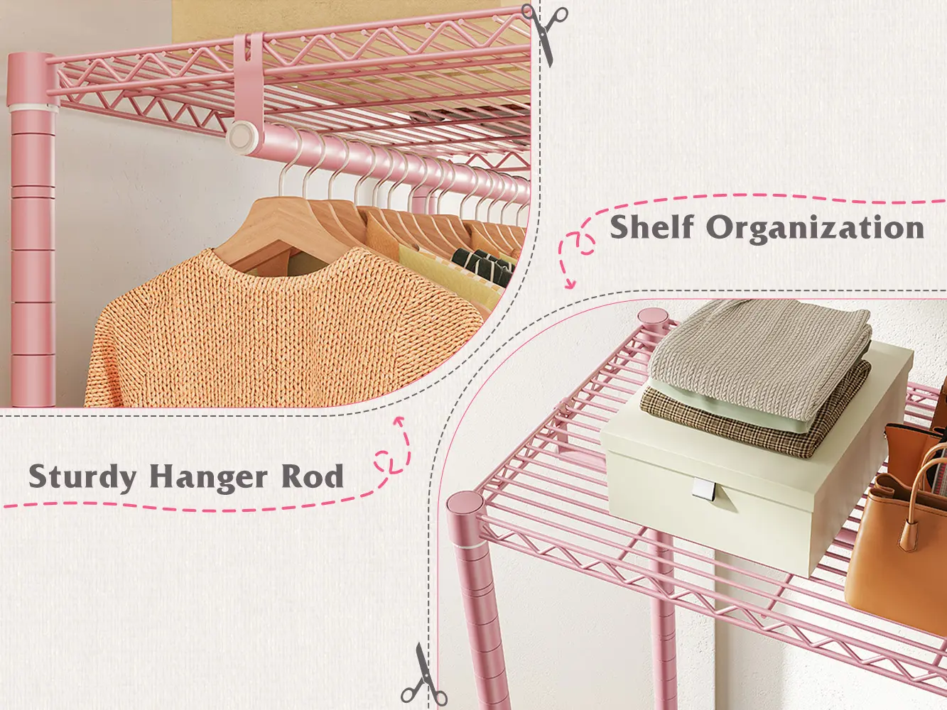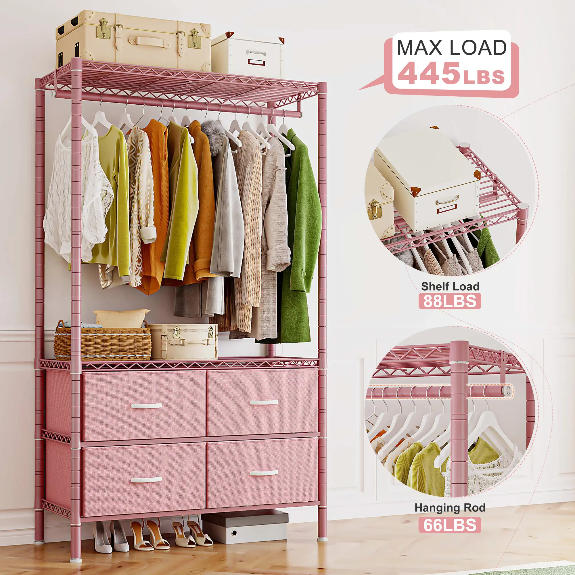 Super Strong: Holds up to 445lbs total — each shelf supports 88lbs, and hanging rods hold 66lbs, so no worries about heavy duty garment rack overloading.