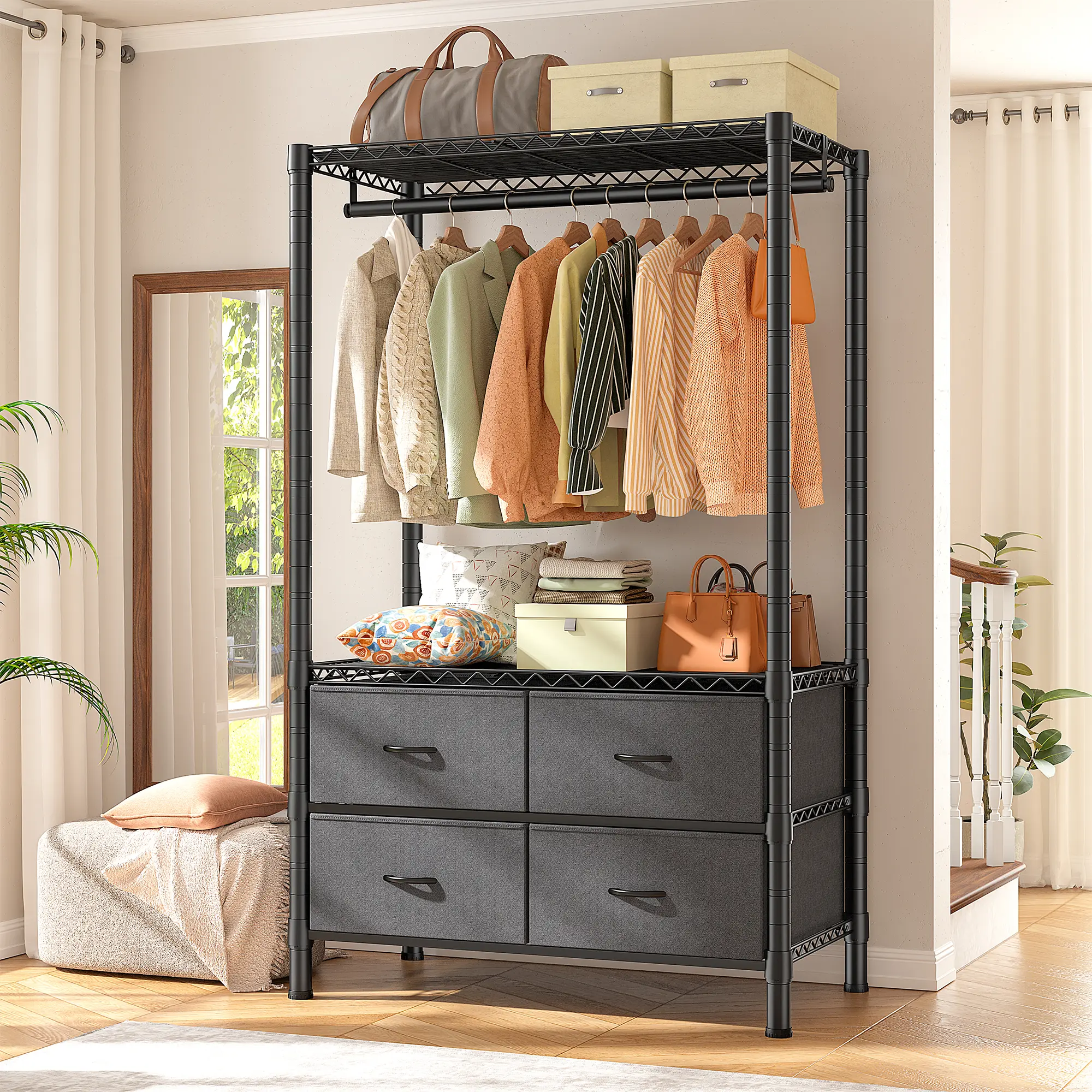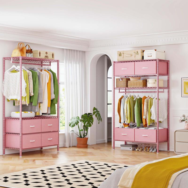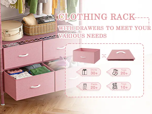 This 3-in-1 clothres rack comes with 4 large fabric drawers, 4 Shelves panels and 1 hanging rods to neatly hang and store all your clothes — from dresses to sweaters to outfits.