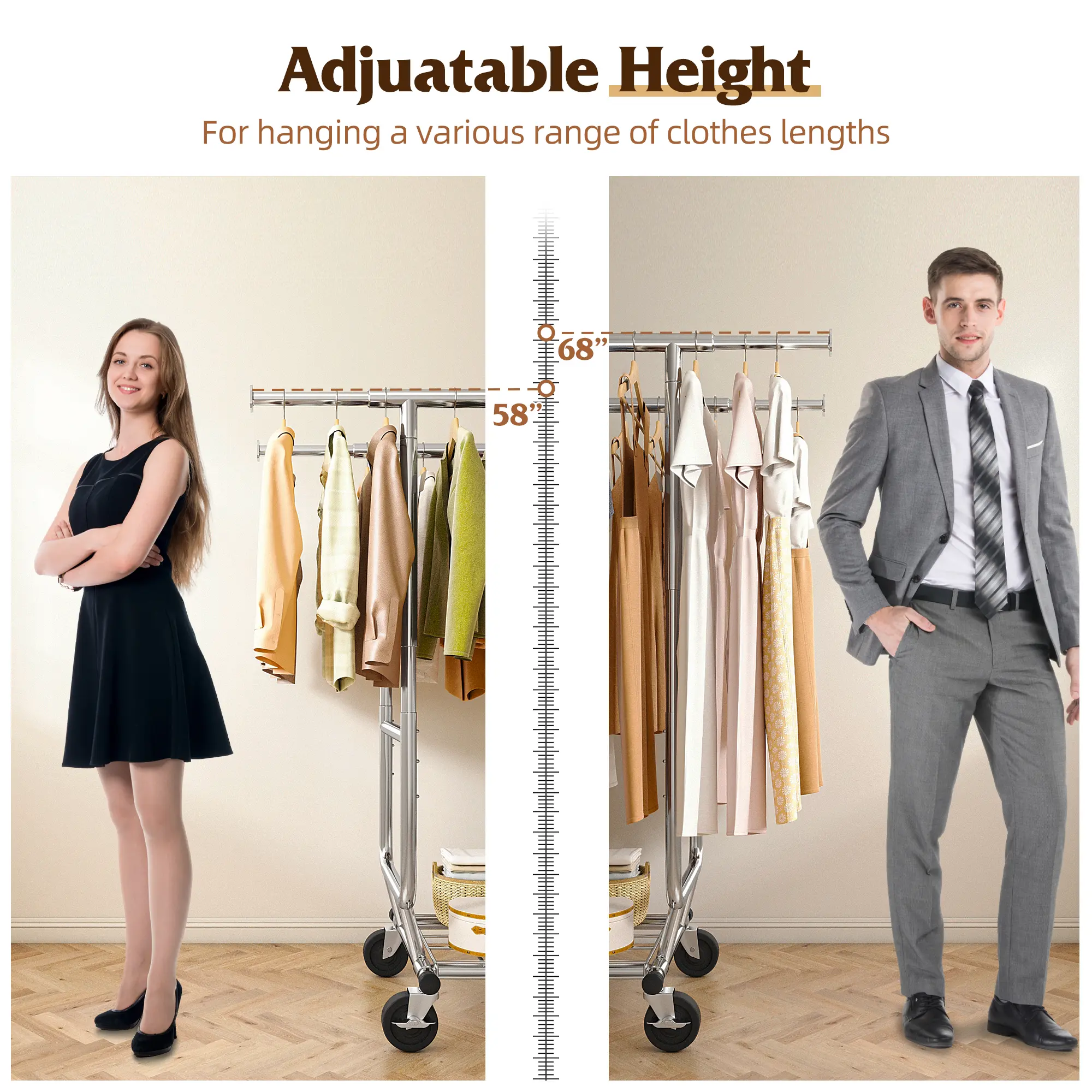 ·Height Adjustable: The height of hanging clothes rack can be adjusted to accommodate various garments and storage needs.