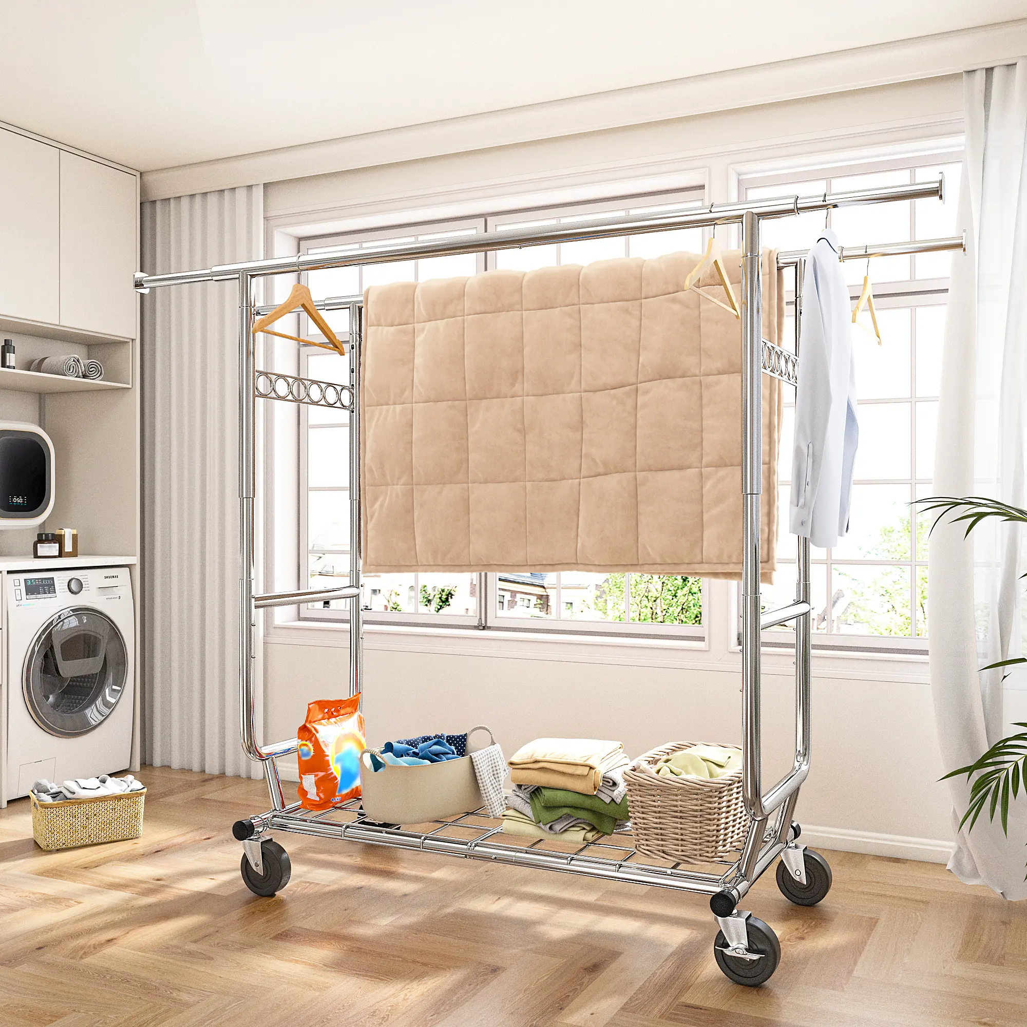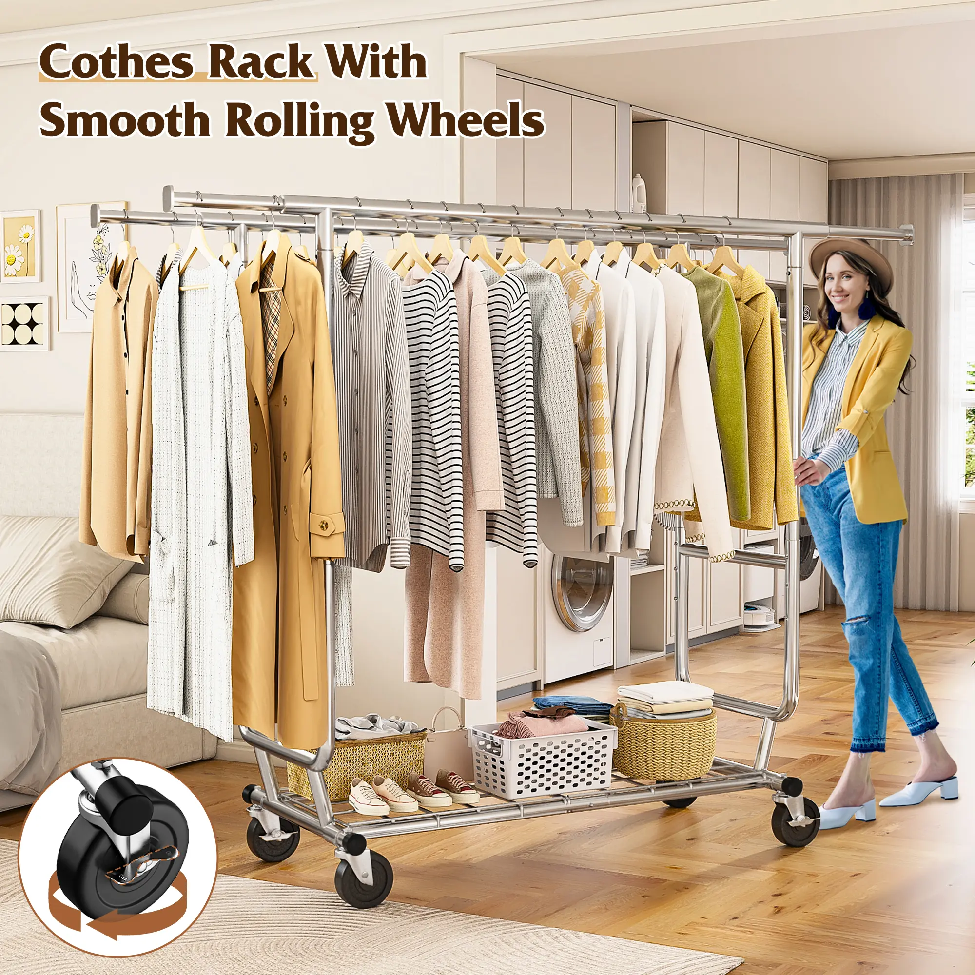 ·Rolling with Wheels: Equipped with wheels, this rolling clothes rack can be easily moved to different locations, providing flexibility in storage and accessibility.
