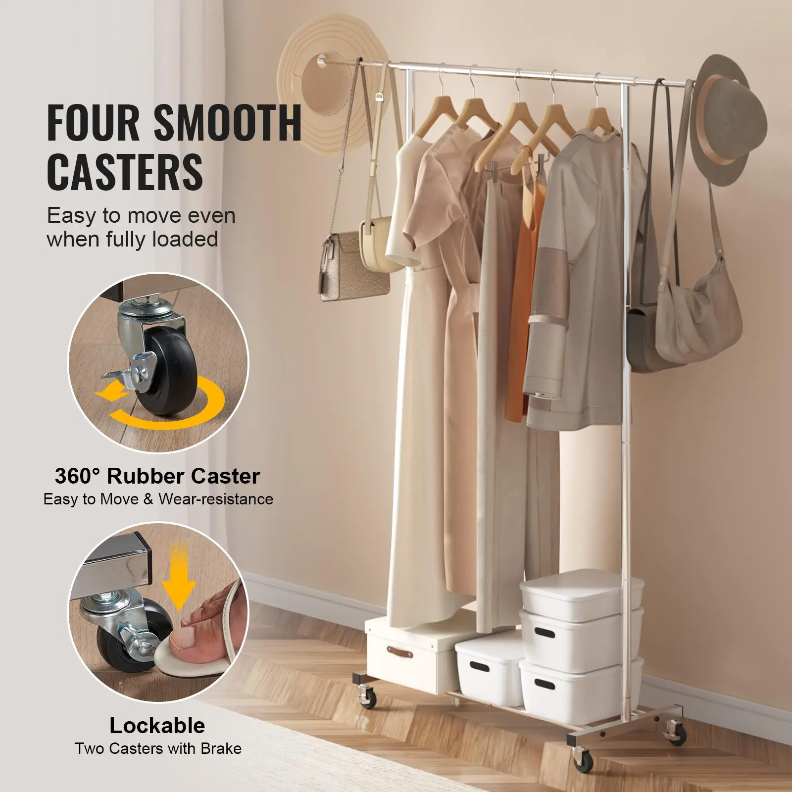 • Move or Fixed: VEVOR rolling garment rack come with four casters, two of which are lockable. Whether you need to effortlessly glide the rack across your bedroom for outfit selection or securely park it in place when ironing, these versatile casters ensure smooth mobility and steadfast stability, adapting to any situation.