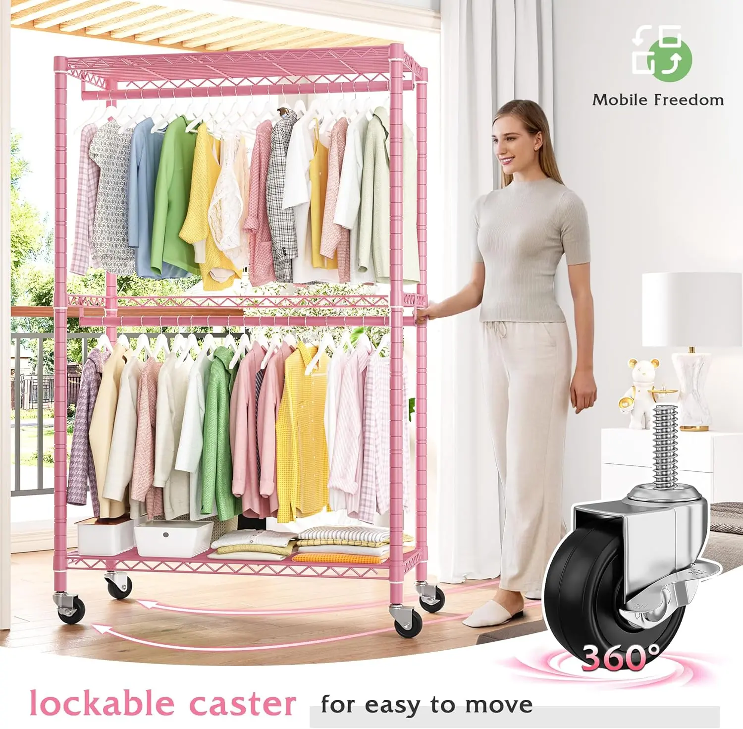 ·【360°Movable & Lockable Wheels】The clothing racks for hanging clothes rack equipped with 4 wheels in bottom, 2 of them can be locked, that can be move or stay it wherever you need at any space, even if filled with items.A rolling clothes rack can reduce the mess when you are cleaning your room.