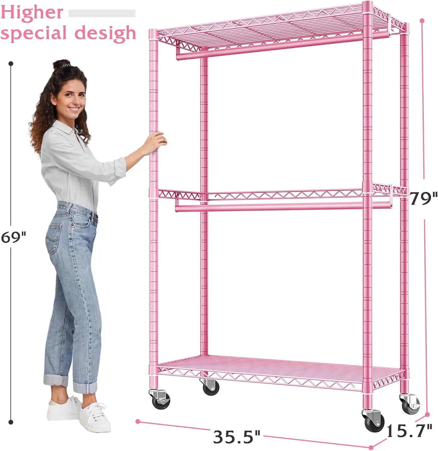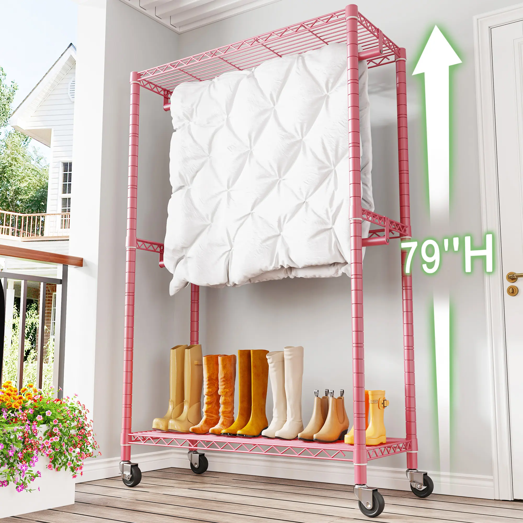 ·【Large Capacity Adjustable Rolling Clothes Rack】Dimensions:79"Hx35.5"W x15.7"D.Weight Capacity: Total 220lbs.2 hanging rods and 2 shelves offers you ample storage area for puting your tops , pants, shoes, heavy blankets and so on.Each shelves of the clothing rack heavy duty can be adjusted up and down for your needs. Heavy duty clothes rack with wheels fits perfectly in your bedroom or small apartment as a walk in closet.
