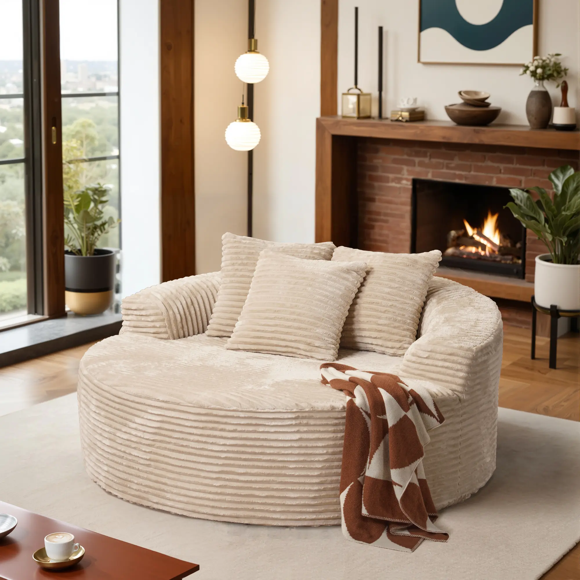 Discover the ultimate in comfort and style with the Oversized Round Chaise Lounge, a modern deep seat cloud couch designed for the living room. This plush corduroy sleeper bed is perfect for lounging and relaxing.