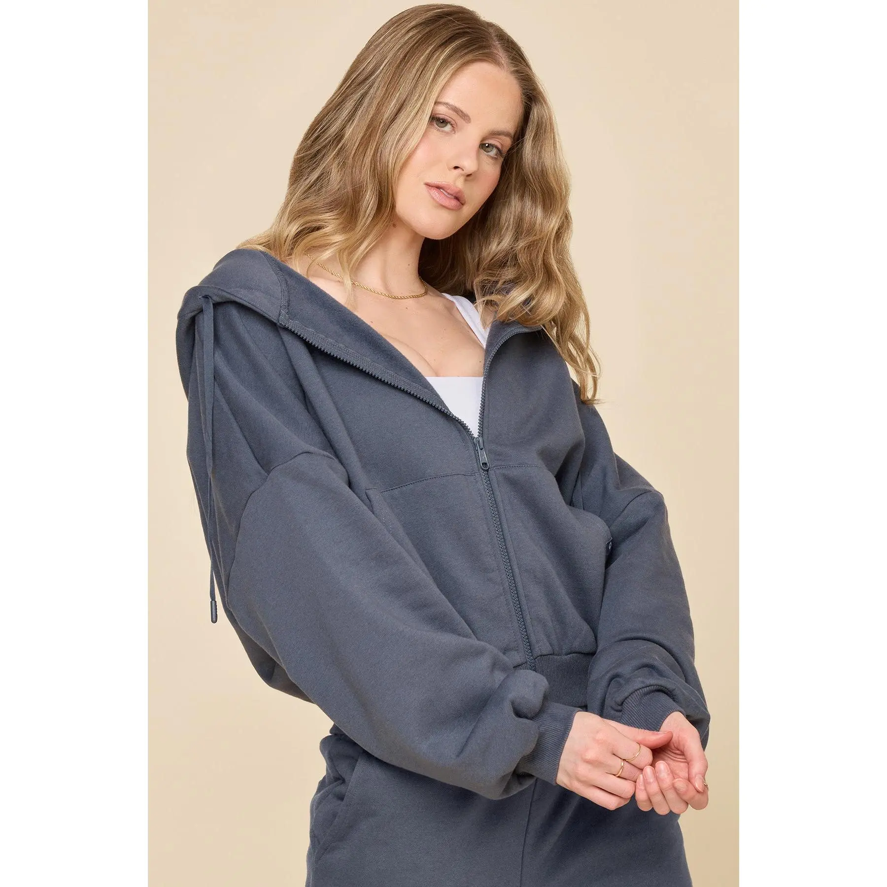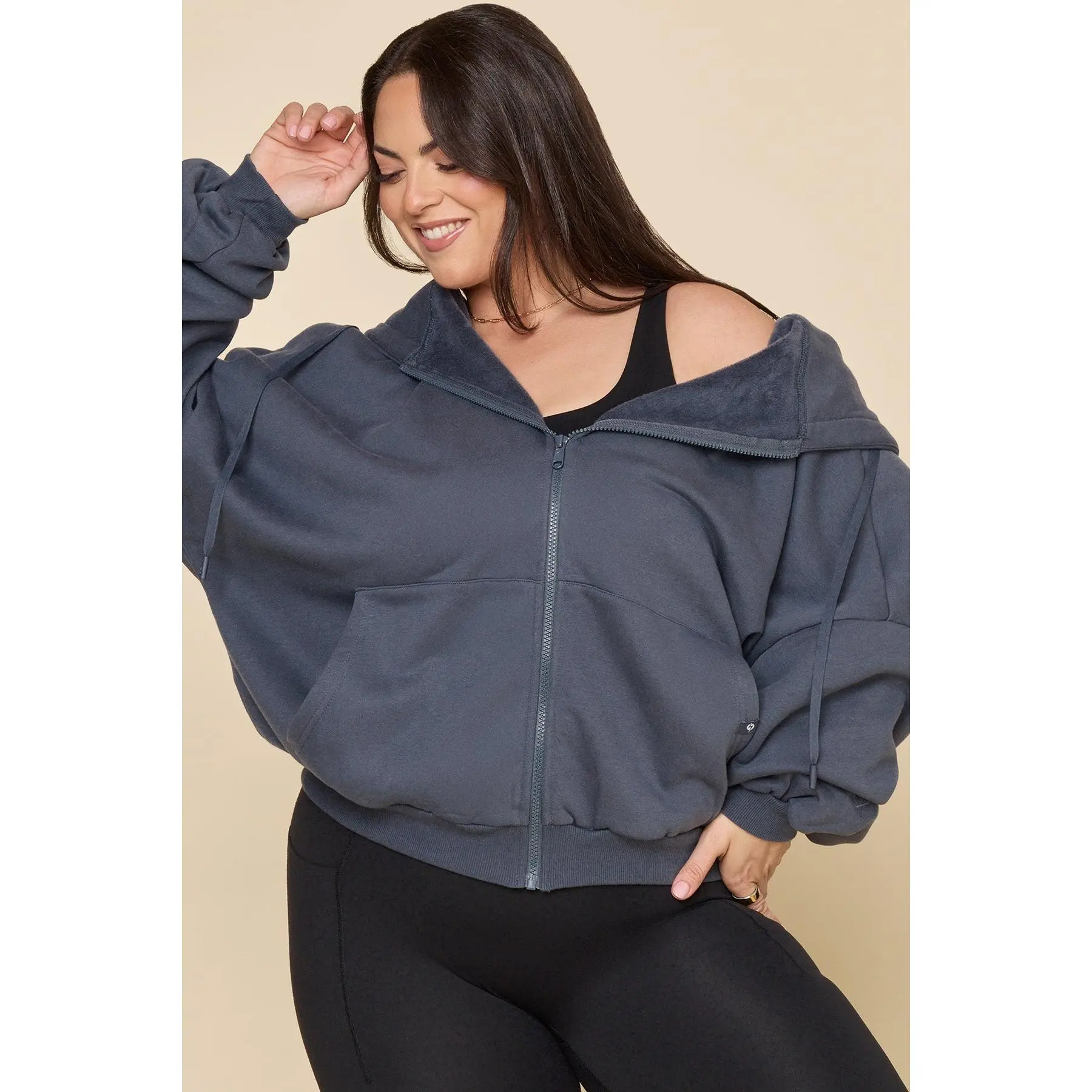 Loveeeeeeeee. The bat wing and drop shoulder is soo cute. So much cute slouch. I am 5'4, 145 lb, usually wear a size 6 in pants. The m/l is great for a very oversized look. I probably could've gone one size down for a less exaggerated oversize look. The inside is a very soft fabric as well. Its feels very warm so not a summer zippie unless your summer nights get really cold.