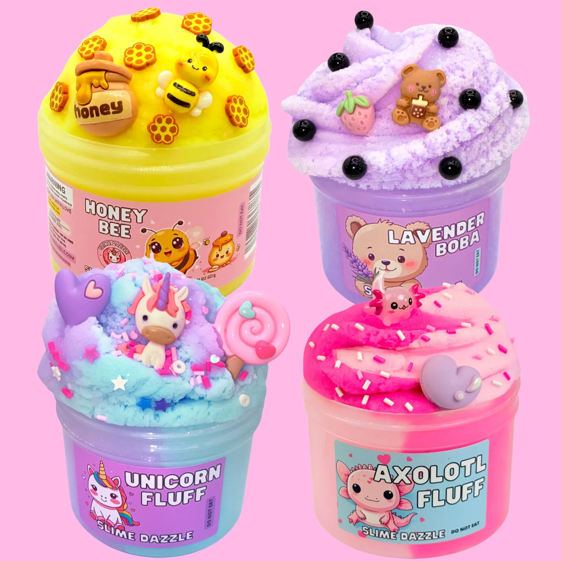 This bundle includes 4 full-size cloud slimes that are soft, fluffy, and completely non-sticky—perfect for beginners and longtime slime lovers alike.