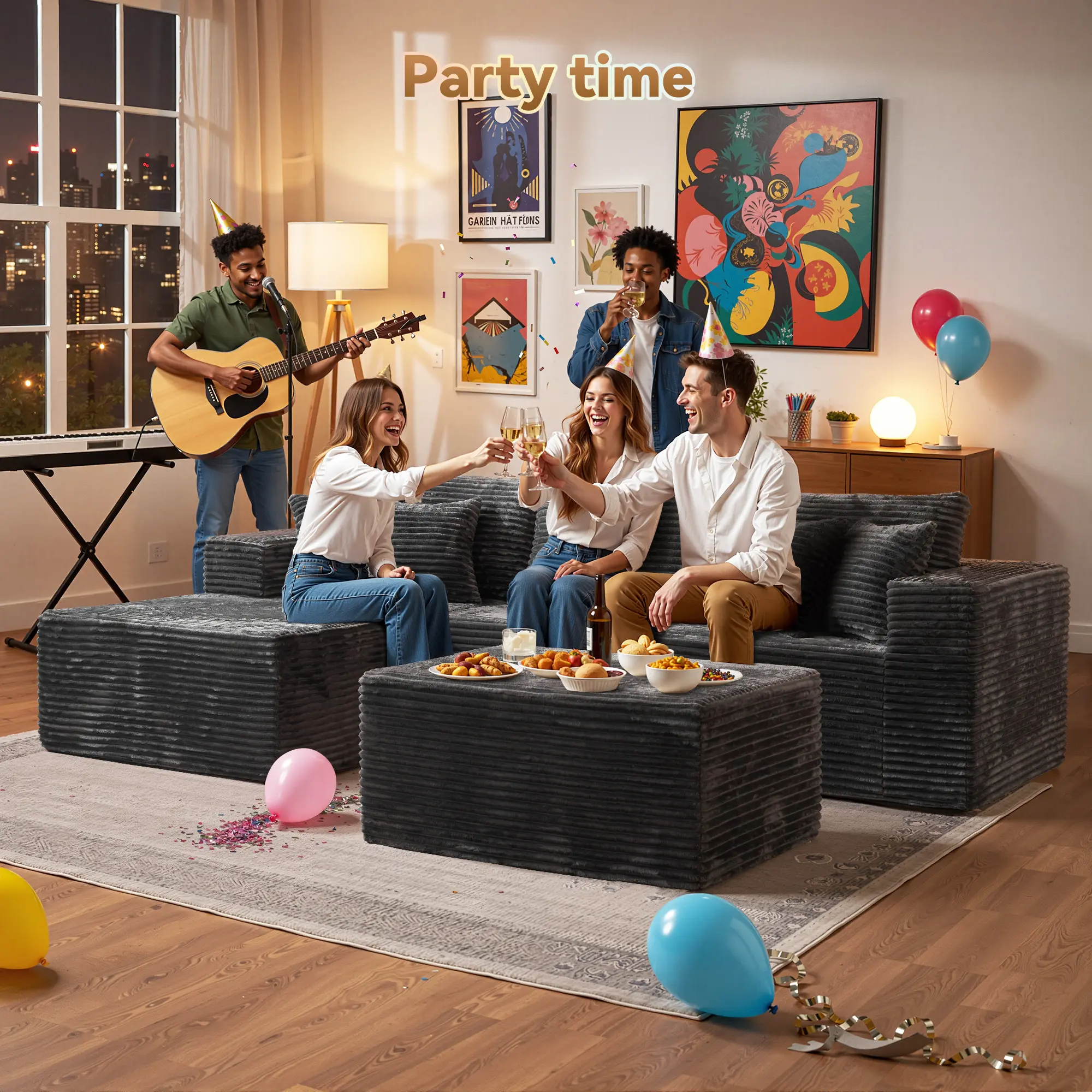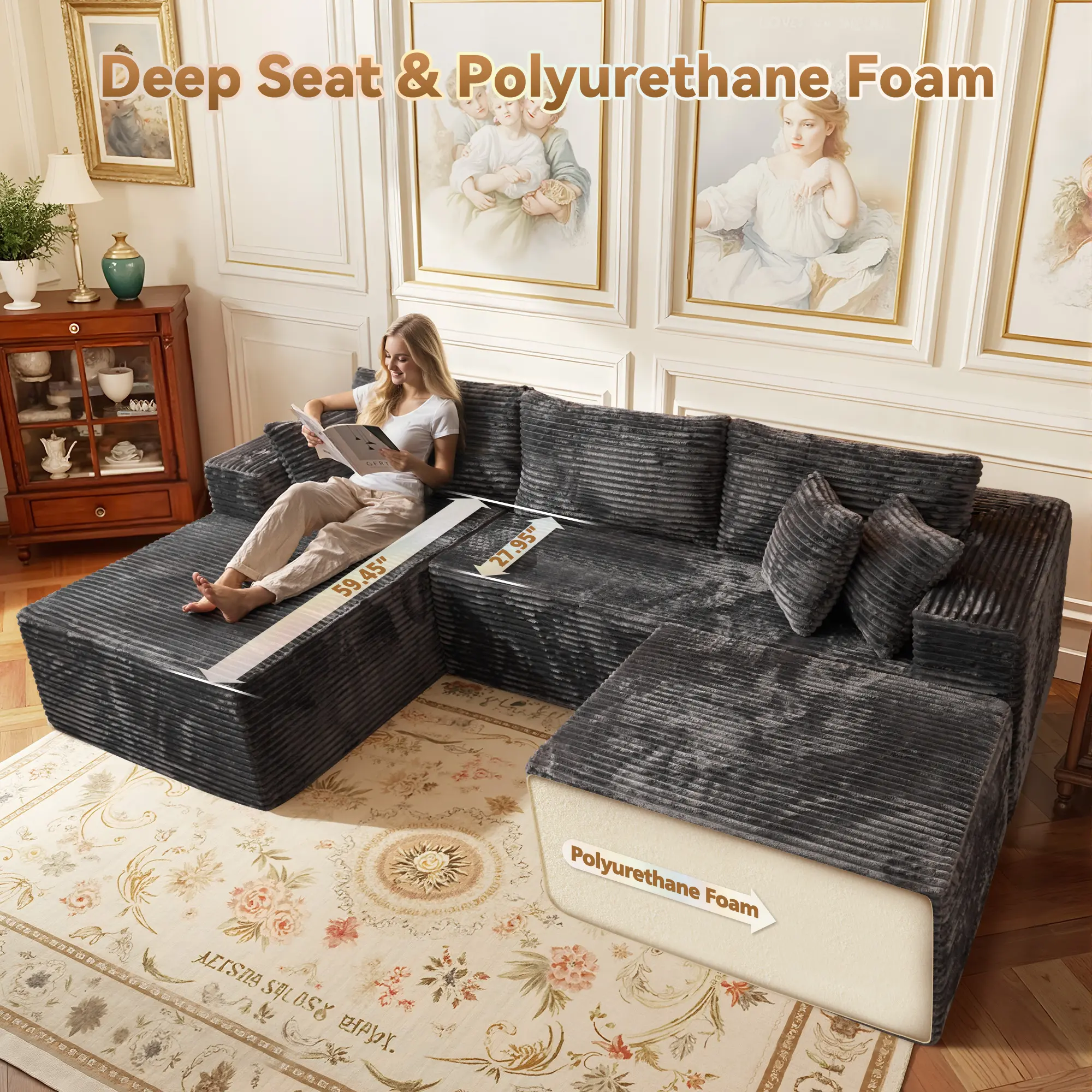 Black Right-Chaise Sofa with Ottoman