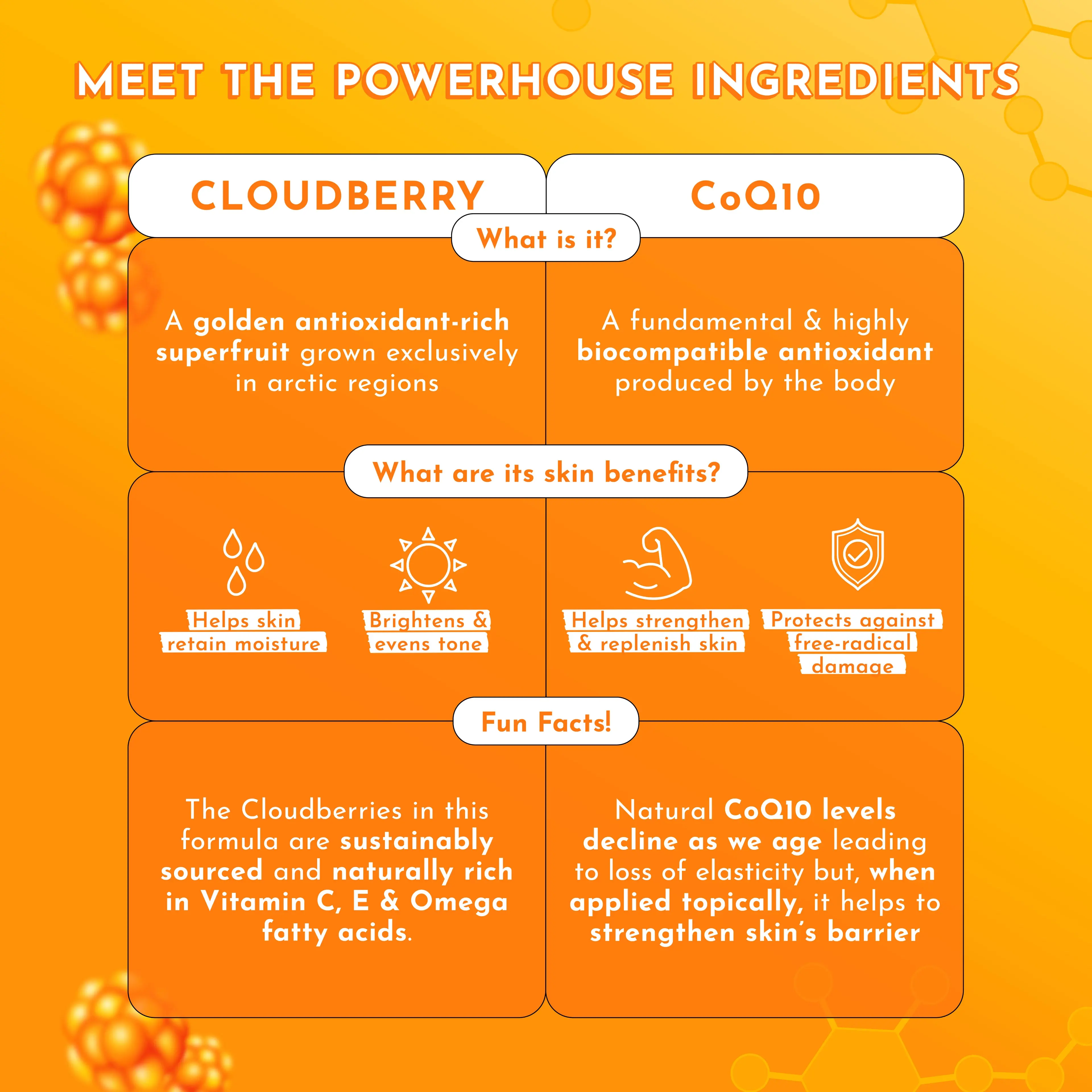 ·CoQ10 (Coenzyme Q10): Powerful antioxidant that strengthens & helps skin retain moisture.