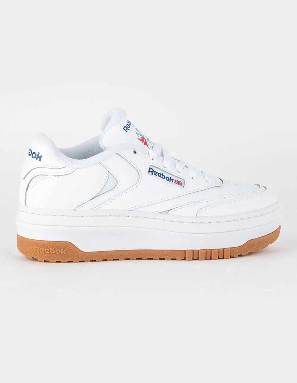 Reebok Club C Extra Shoes. Being extra is a good thing. These women's Club C Extra shoes prove it. An exaggerated platform midsole with a geometric design gives you an amplified look. Don't miss the outsole which has a 3D tennis racket effect. Subtle hits of iconic color on the leather upper seal the deal. Leather upper with nylon pops. Lace closure. EVA midsole. Terry cloth tongue and collar. Textured rubber outsole. Imported.