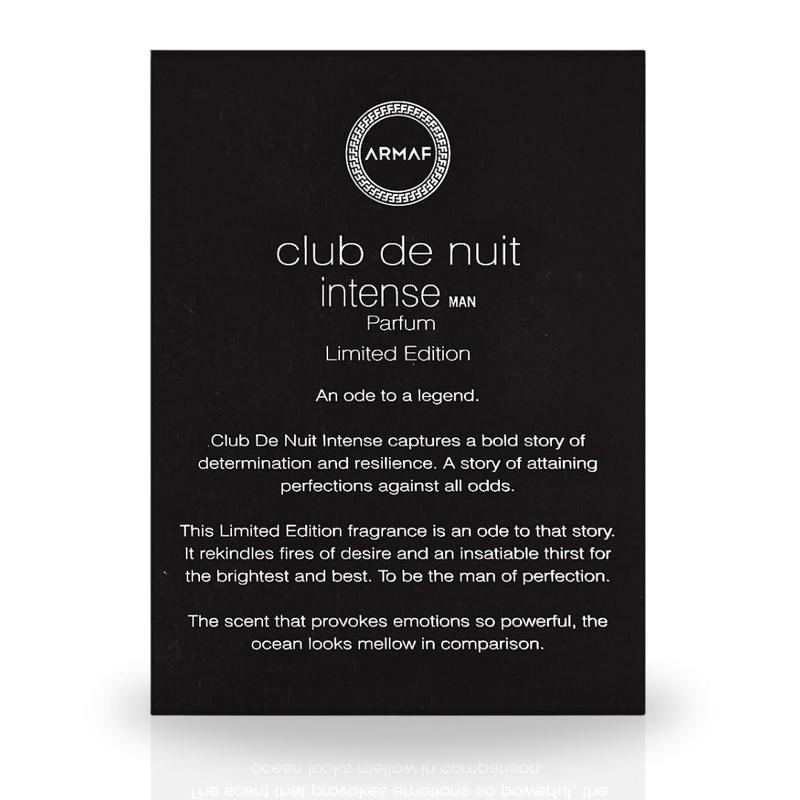 Dive into the luminous essence of 'Club De Nuit Intense Men Limited Edition Pure Perfume', a fragrance that masterfully blends zesty citrus, vibrant florals, and rich, warm base notes.