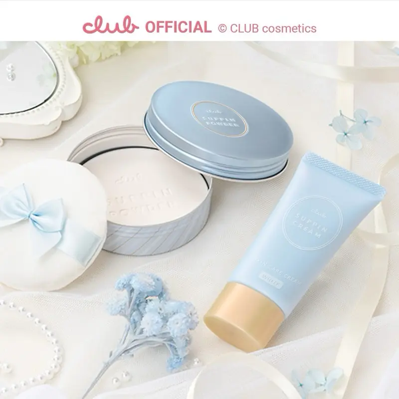 CLUB Suppin Brightening Collection is a Japanese skincare set featuring a primer cream and finishing powder to create a natural, bright, no-makeup makeup look.